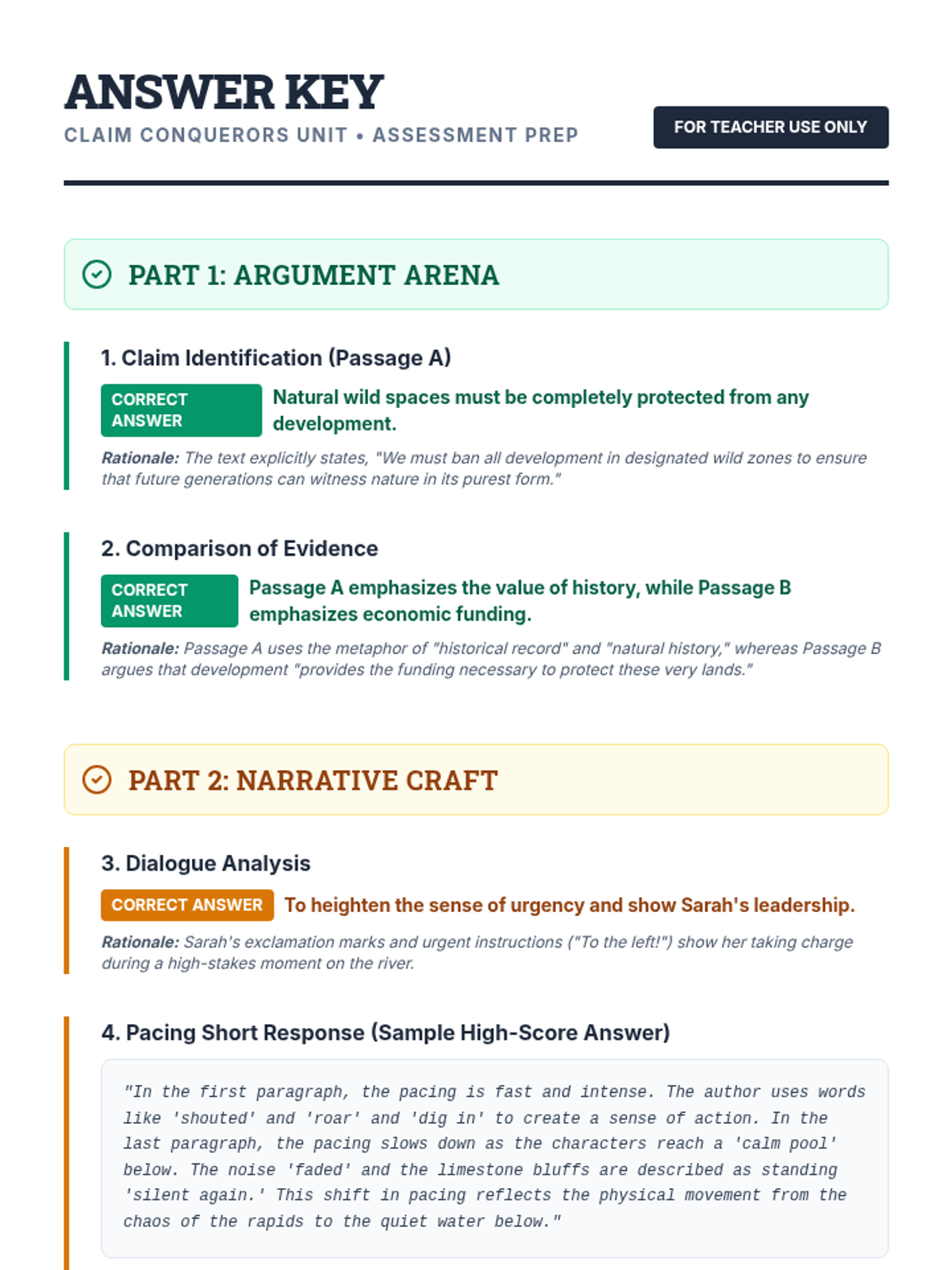 A detailed answer key for the Claim Conquerors worksheet. Provides correct answers, rationales for informational and narrative questions, and a high-score sample response for the pacing analysis.