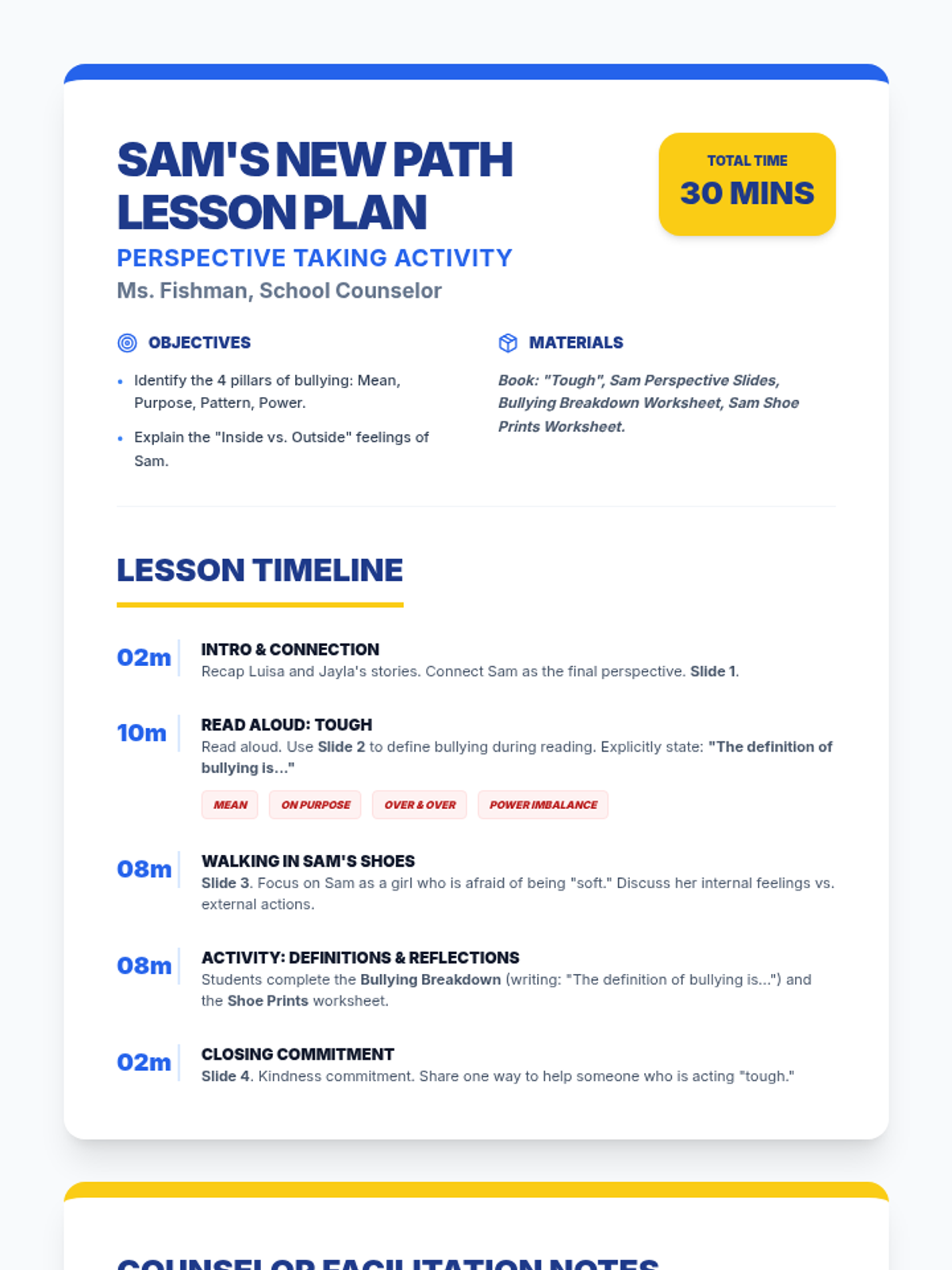 A comprehensive 30-minute lesson plan for the Sam's New Path lesson. It integrates the book "Tough", the presentation slides, and the student worksheets into a timed instructional schedule focused on perspective-taking.