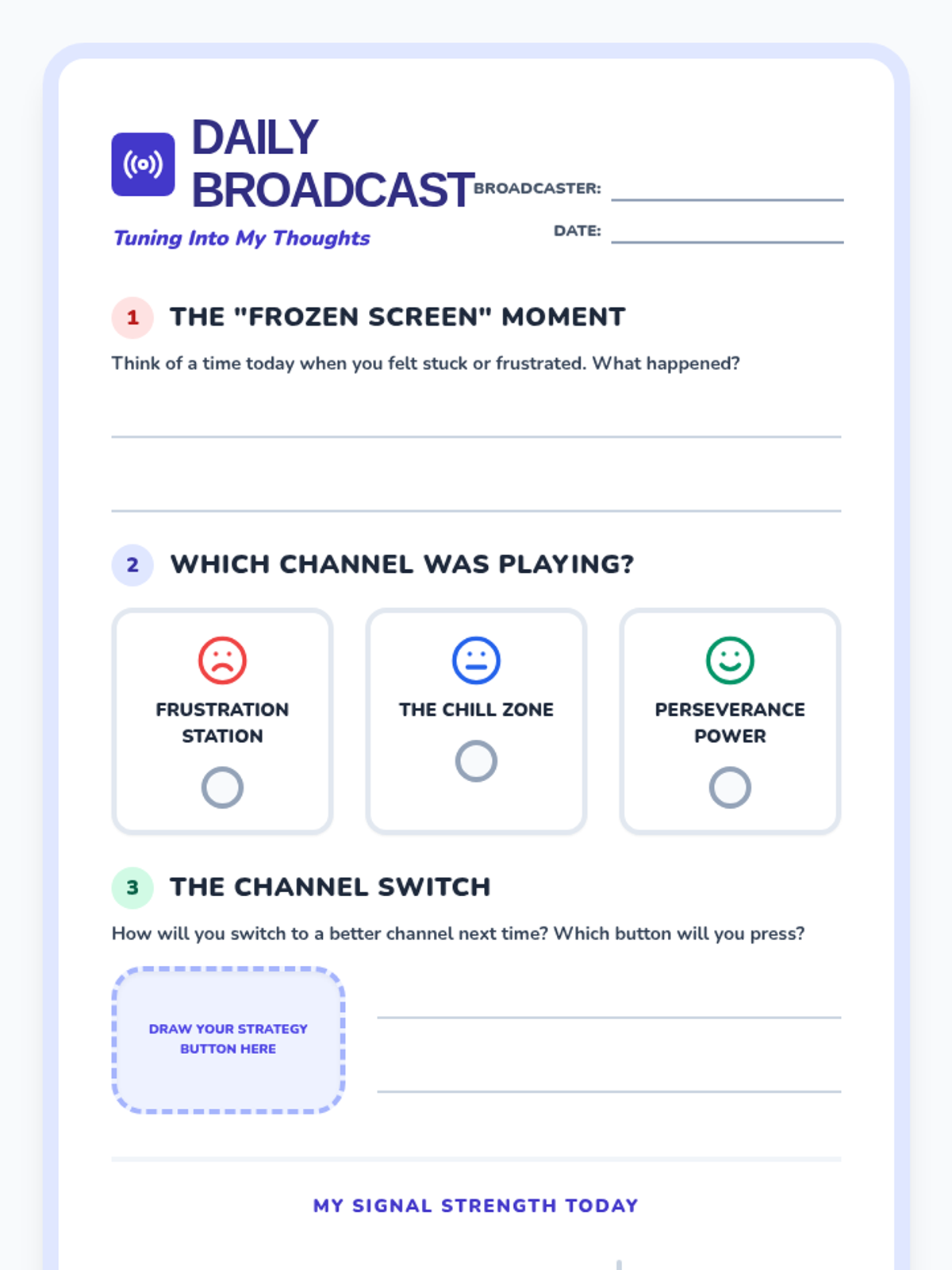A structured reflection journal for students to track their emotional 'broadcasts.' It prompts them to identify frustration triggers and plan how they will 'switch channels' in the future.
