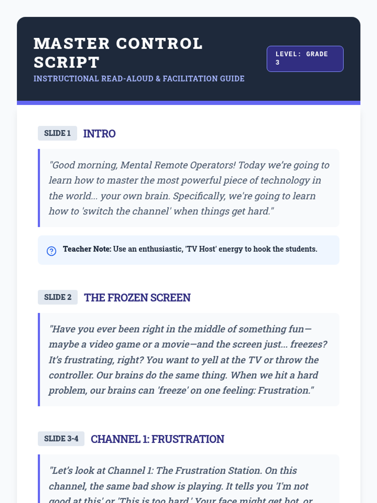 An engaging slide deck using a remote control metaphor to teach 3rd graders about cognitive flexibility. Features visual breakdowns of 'channels' representing frustration, calm, and perseverance.