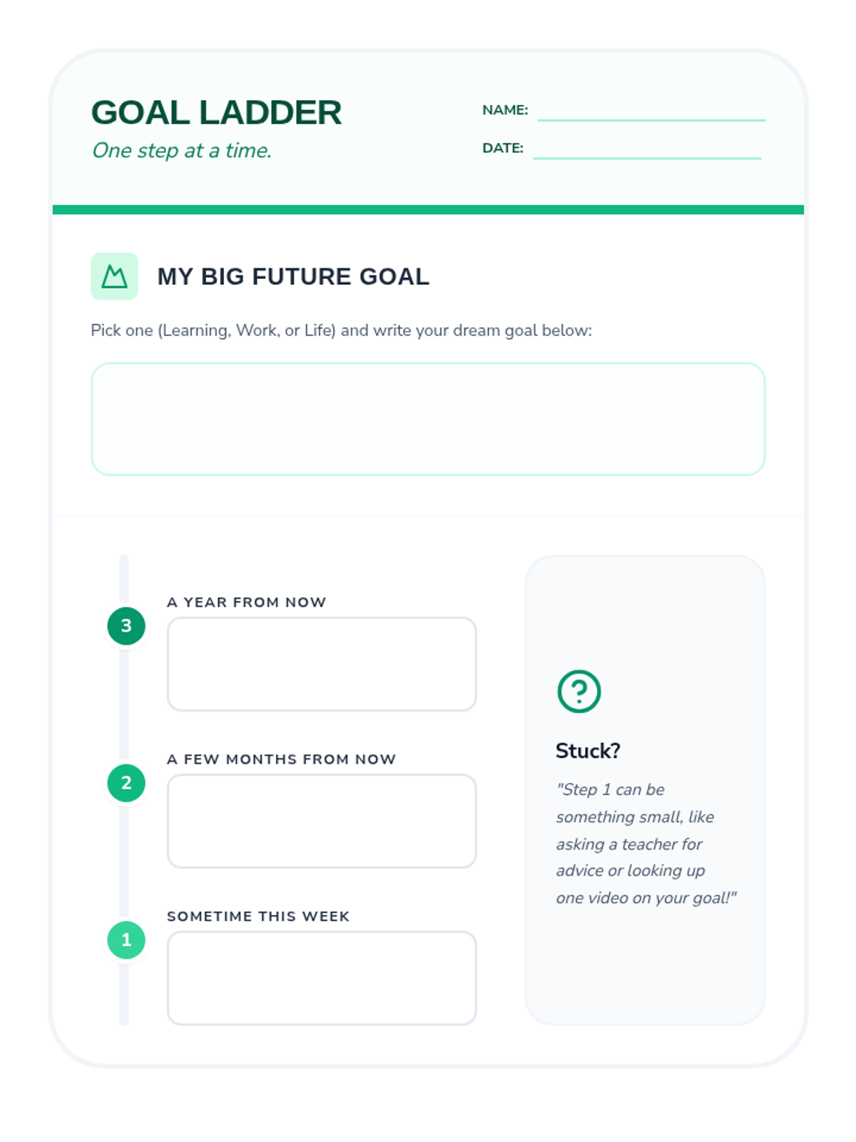 A scaffolded goal-setting worksheet ('Goal Ladder'). Revised for single-page layout, increased writing space (80px-120px height), and higher contrast labels. Fixed icons and page flow.