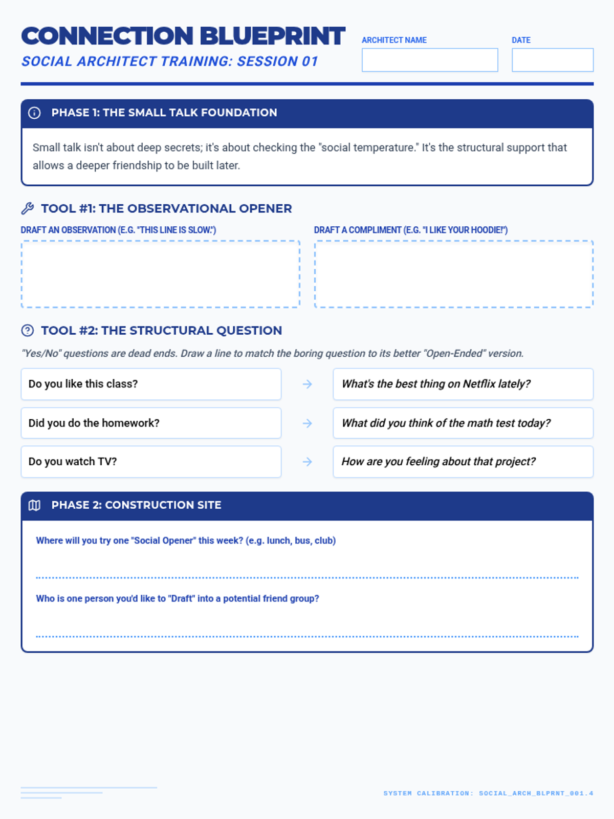 A revised blueprint-themed worksheet for adolescents to practice small talk openers and open-ended questions, with improved formatting and clear student work areas.