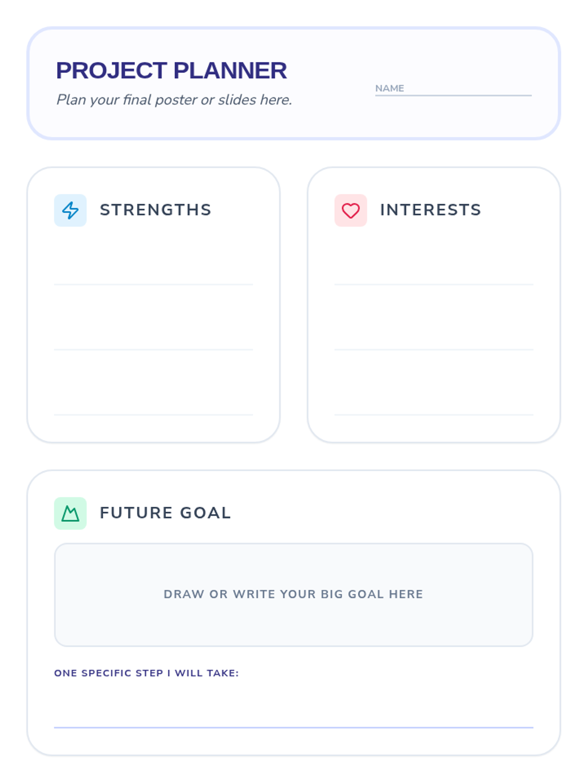 A final project planning sheet. Revised to fix page breaks in the sketch area, increase header contrast, and provide more space for writing steps and goals. Landscape layout guides for final project alignment.