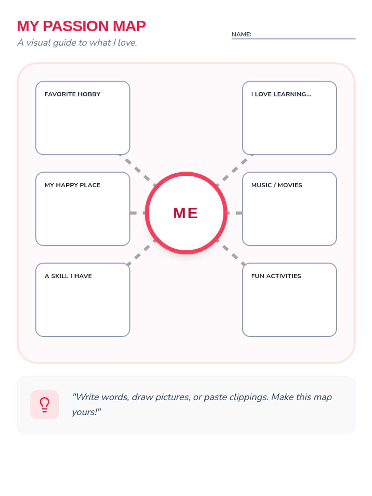 A visual graphic organizer ('Passion Map') where students can map out their interests using words or drawings. Revised for consistent box sizes, higher contrast, and better line visibility. Fixed hub overlap issues.