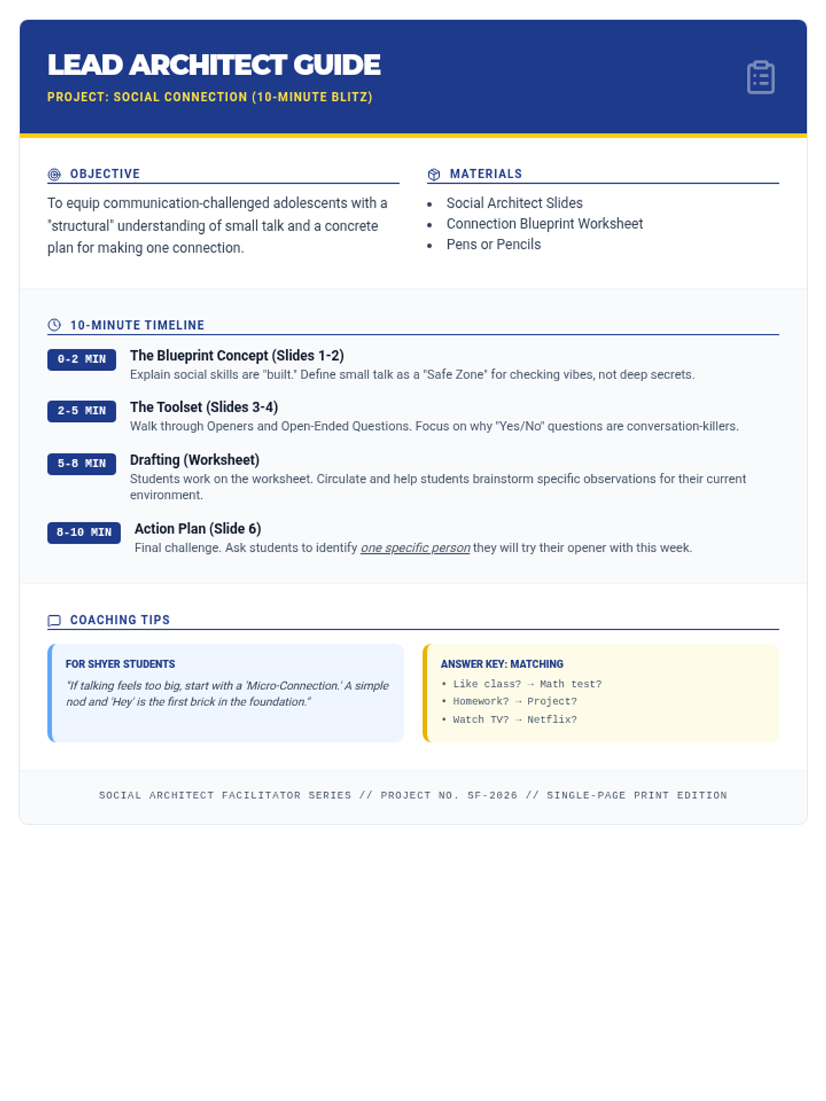 A revised teacher guide for the 'Social Architect' lesson, optimized for single-page printing and improved visual contrast.
