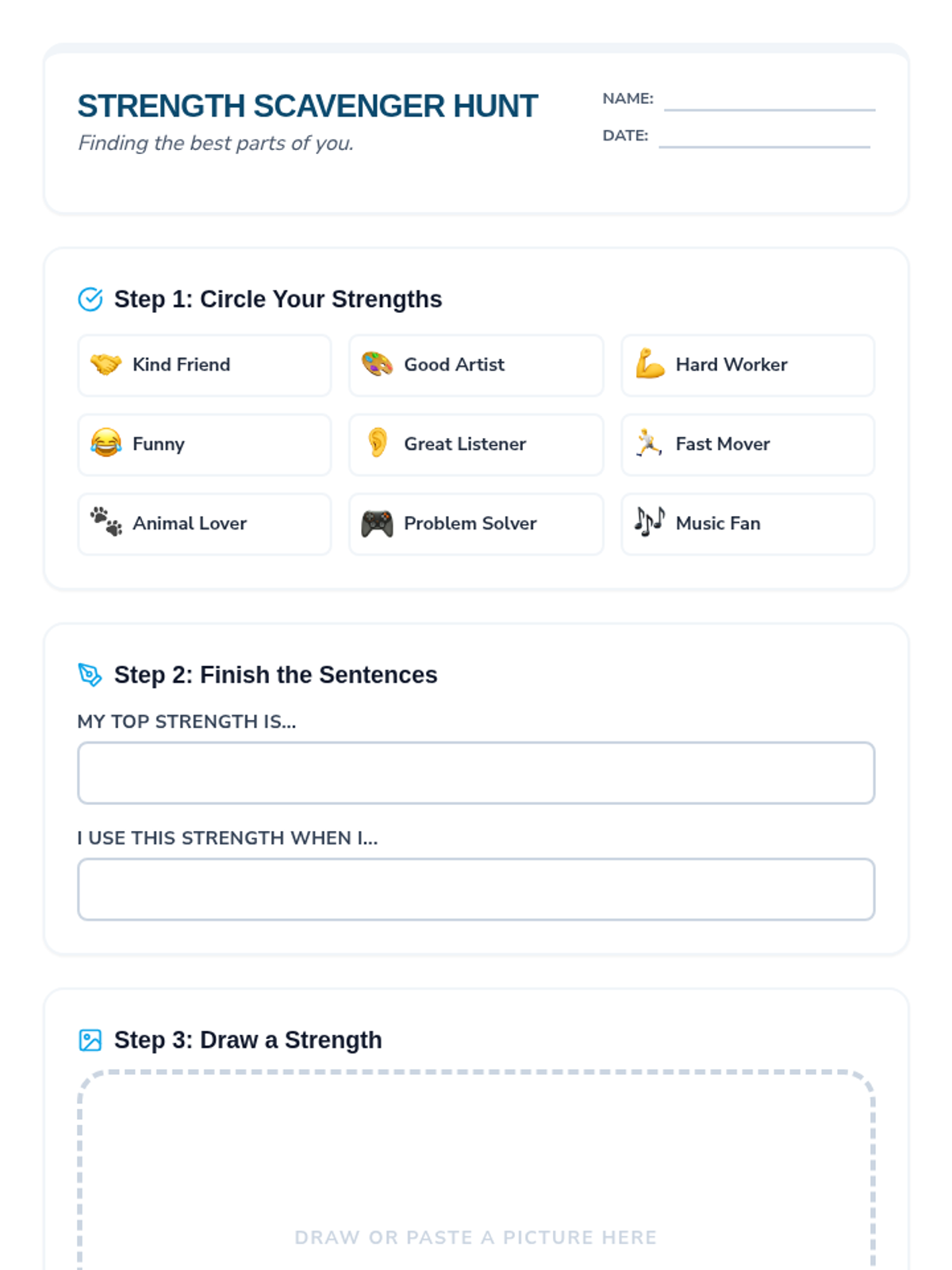 A scaffolded student worksheet for identifying personal strengths. Includes a visual checklist, sentence starters for expressive support, and a drawing area for visual expression. Fixed page breaks and work area visibility. Darkened drawing border for print quality.