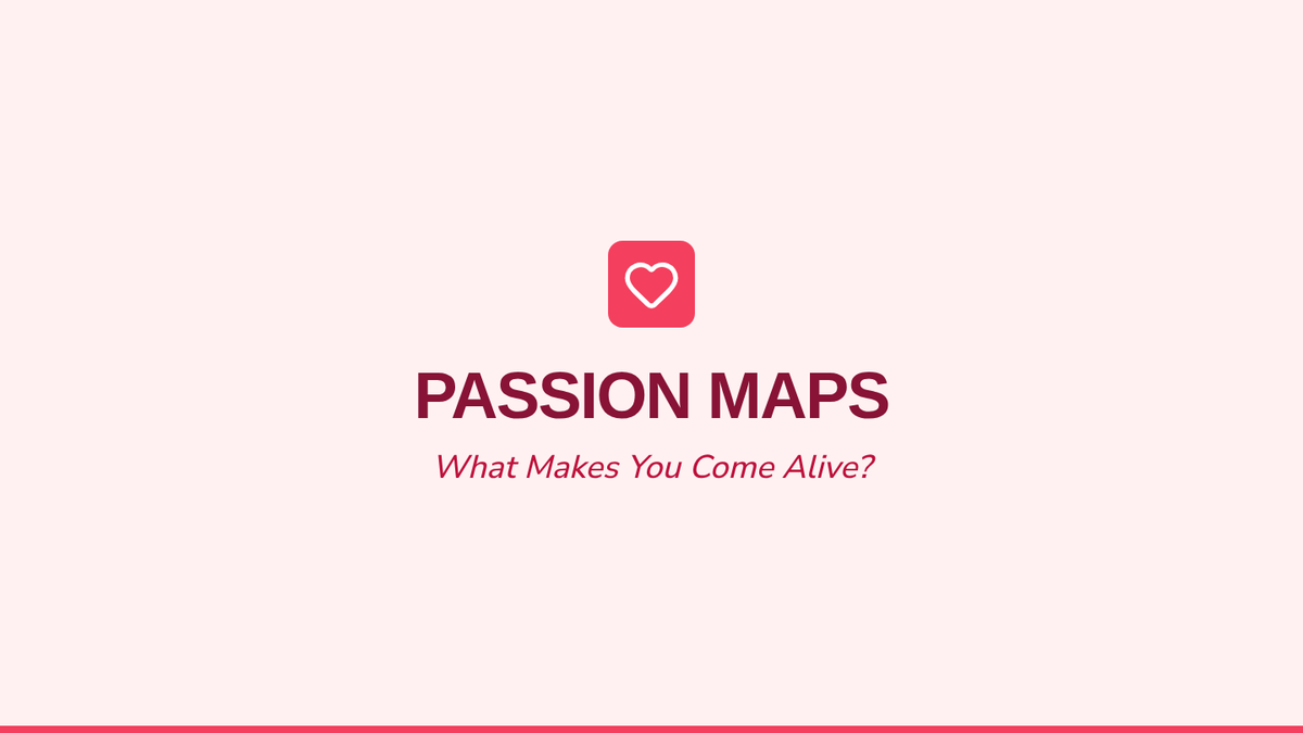 Presentation for 'Passion Maps' focusing on the distinction between internal strengths and external interests. Uses high-contrast visuals and emojis to categorize common high school interests.