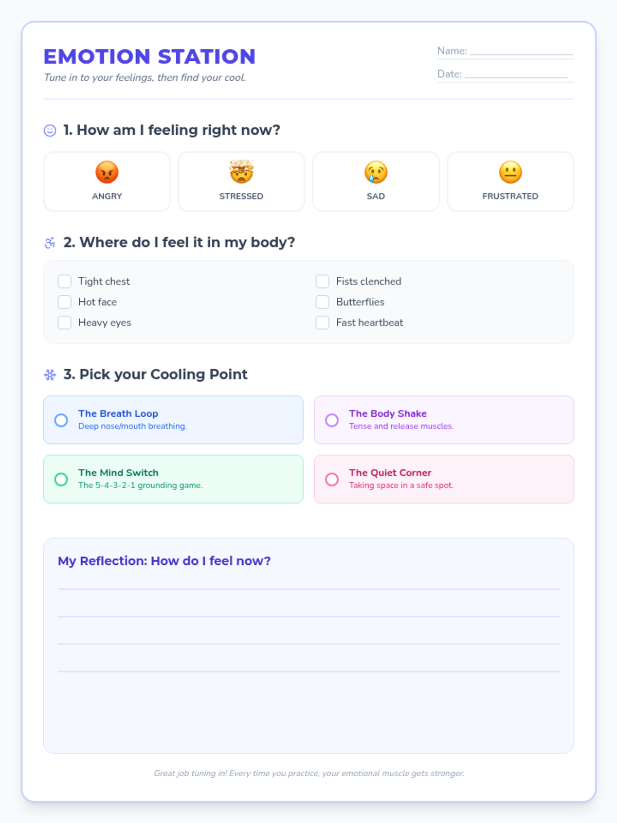 A structured reflection worksheet for students to identify their feelings, physical sensations, and choose a 'Cooling Point' strategy.