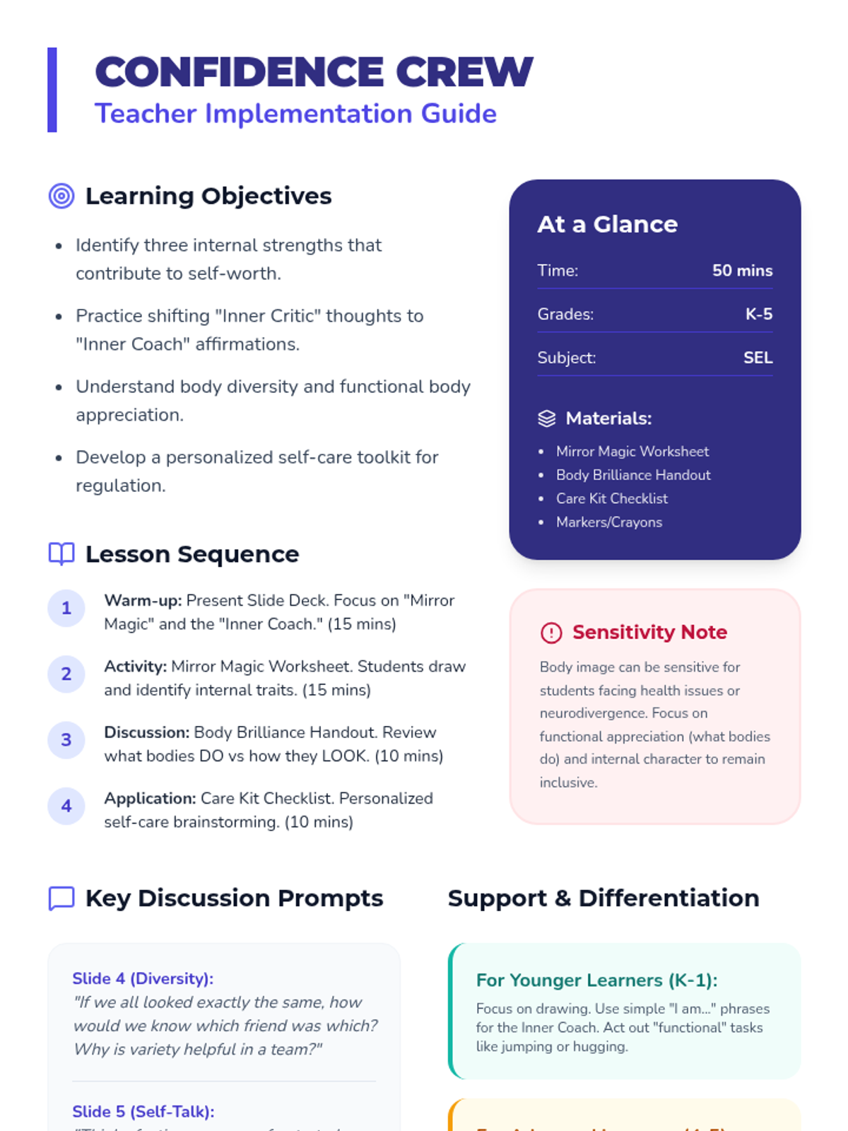A comprehensive teacher's guide providing lesson objectives, discussion prompts, differentiation strategies, and logistics for the Confidence Crew lesson.