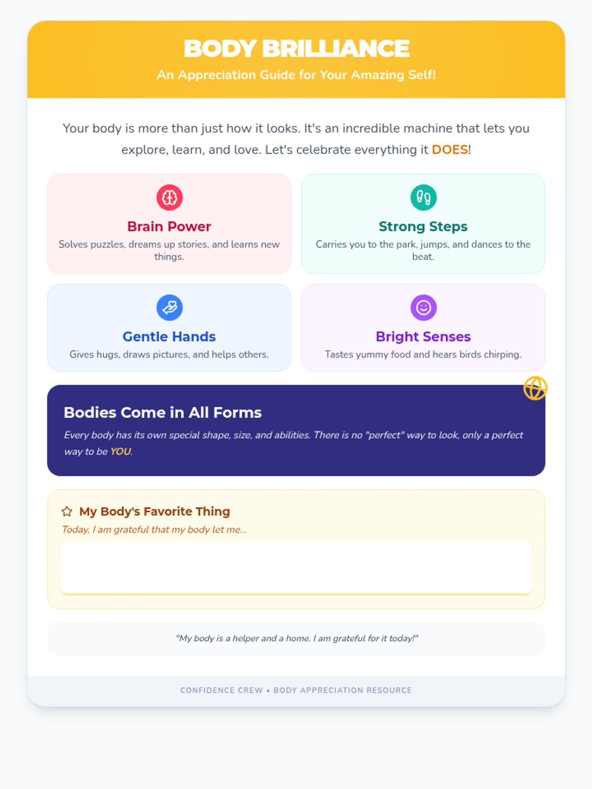 An informational handout for elementary students focusing on functional body appreciation and celebrating body diversity.