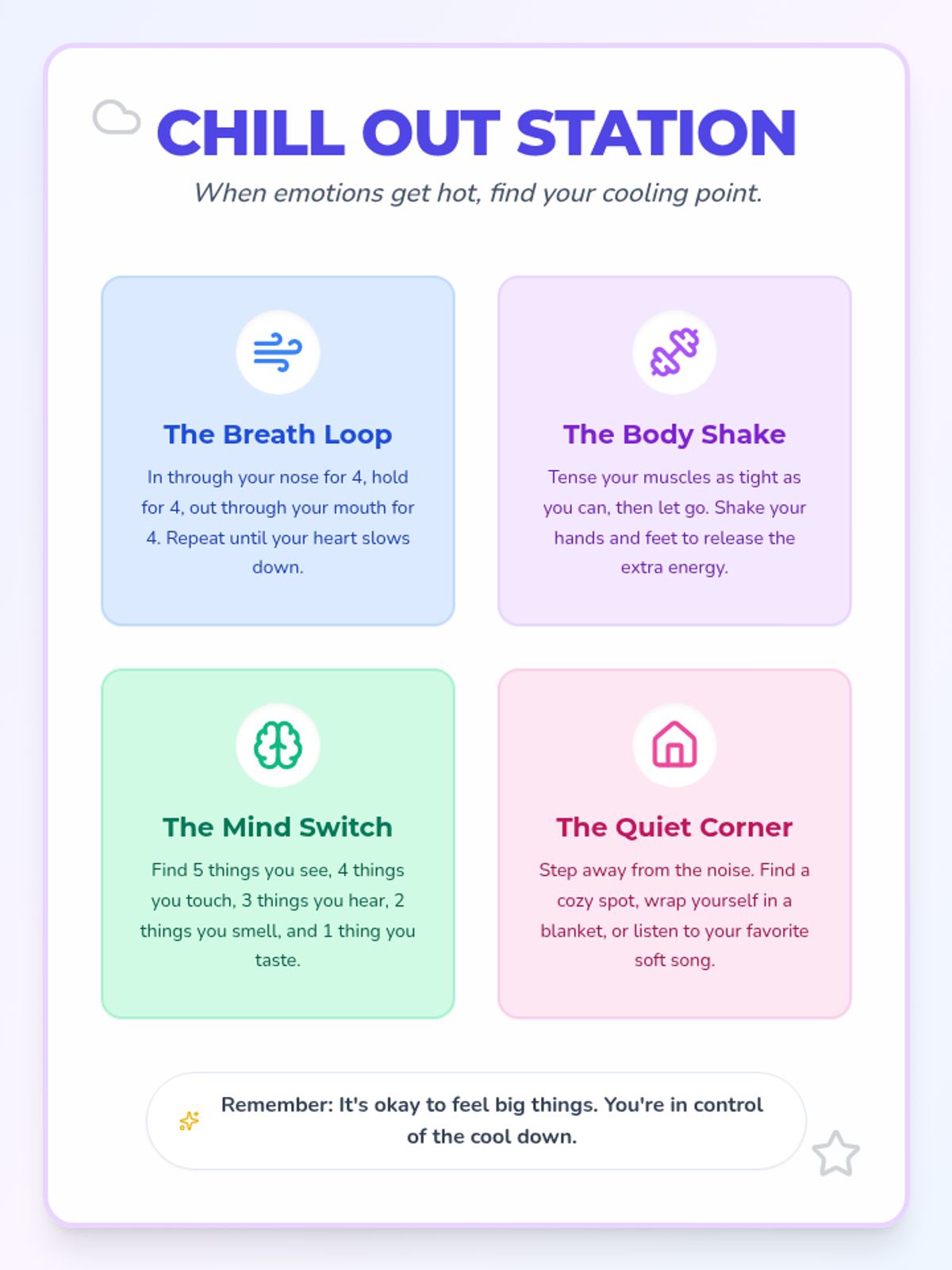 A vibrant and calming visual poster for 10-year-olds featuring four core 'Cooling Points' (Breath, Body, Mind, and Space) to help manage intense emotions.