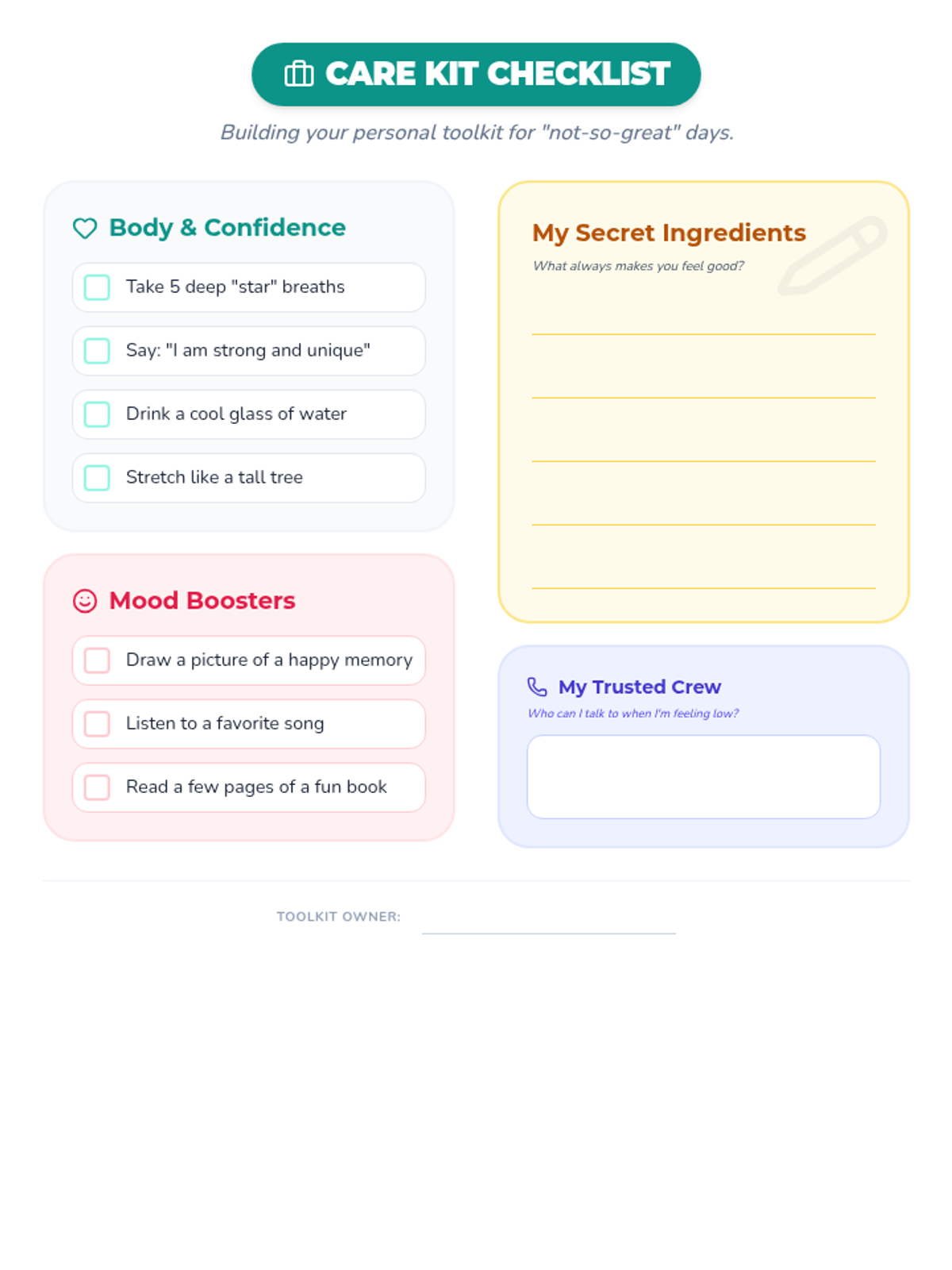 A self-care toolkit worksheet where students can identify pre-filled coping strategies and brainstorm their own personalized favorites.