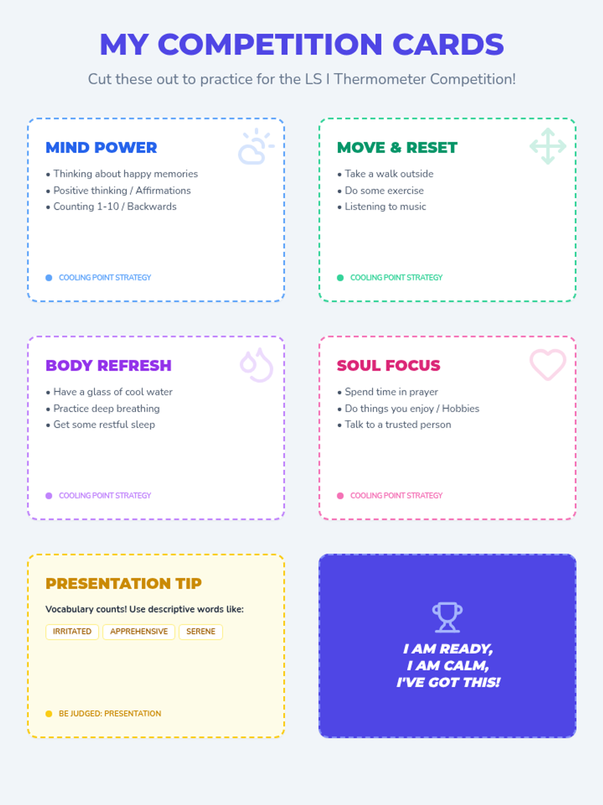 Updated pocket reminder cards featuring the specific competition strategies (happy memories, music, walking, water, breathing, sleep, hobbies, exercise, counting, and prayer).