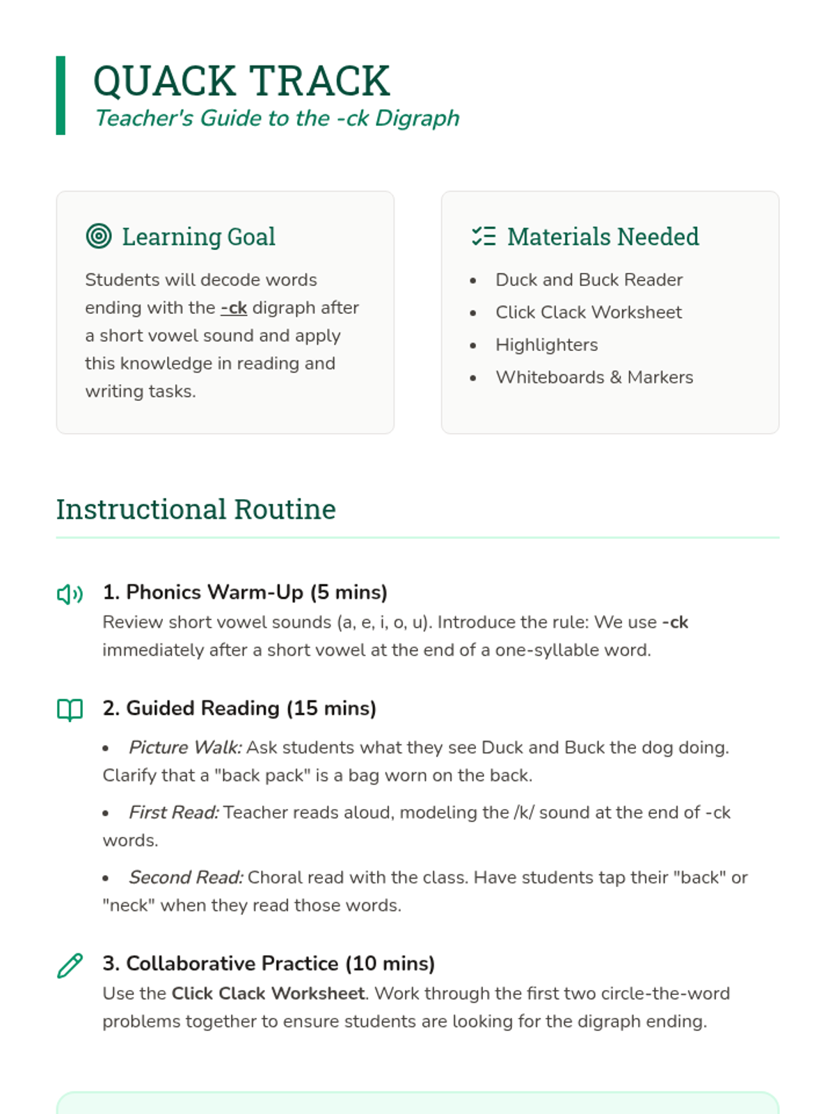 A teacher's guide for the '-ck' digraph lesson, providing instructional steps and teaching notes for the revised story.