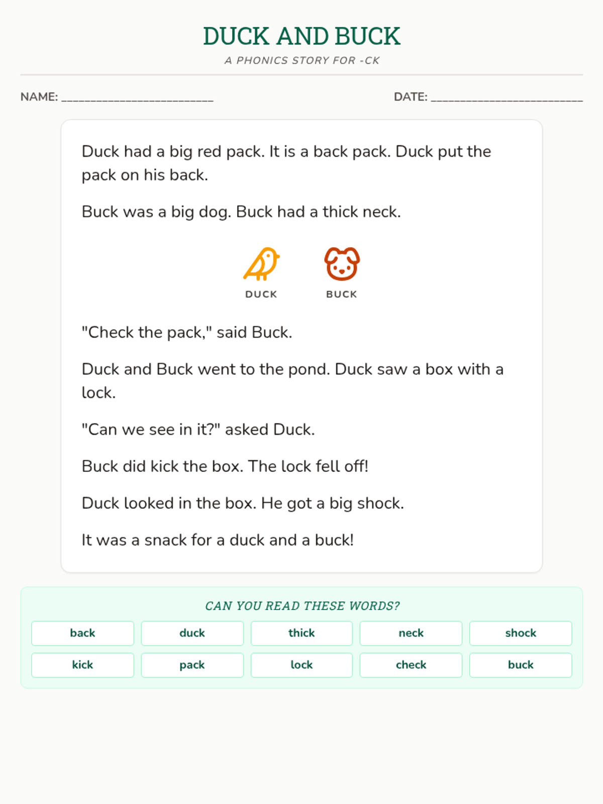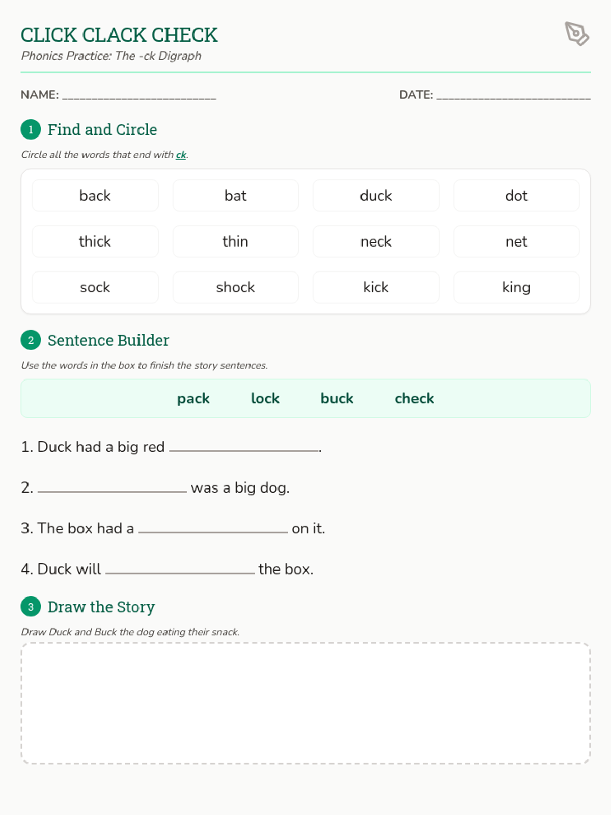 A phonics worksheet for students to practice identifying and writing words with the -ck digraph. Updated to match the revised story and ensure one-page layout.