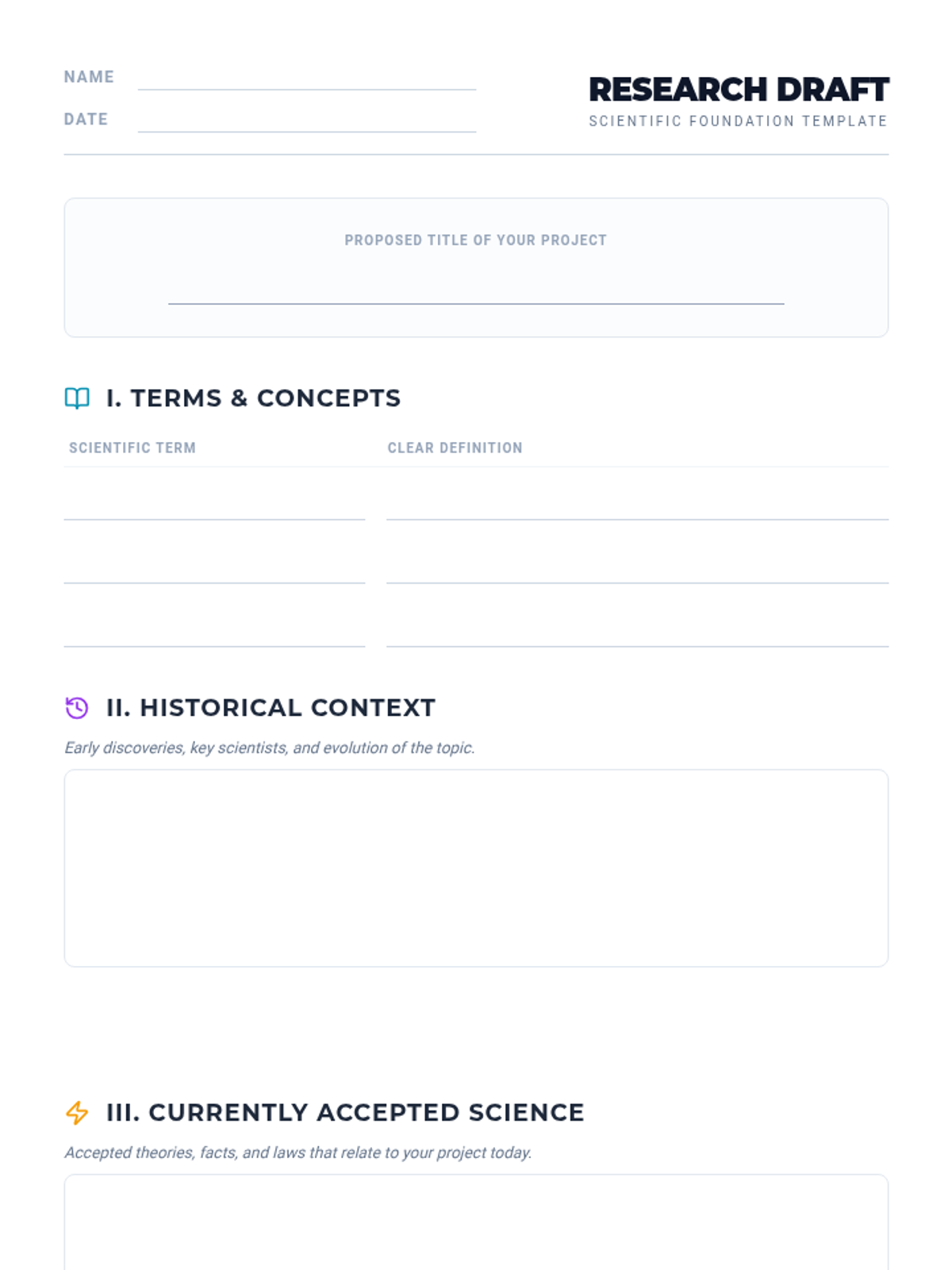 A multi-page research paper template with structured sections for terminology, history, current theories, hypothesis support, and MLA citations.