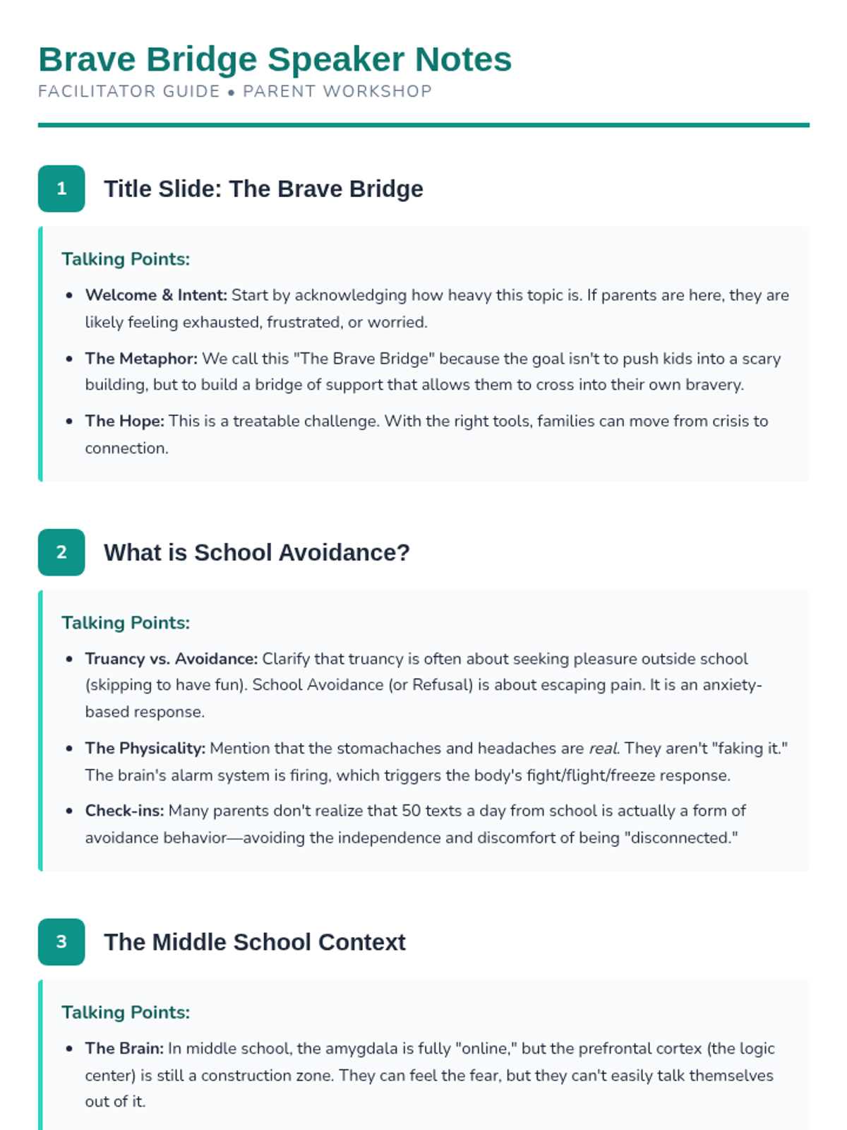 Detailed speaker notes and talking points for the Brave Bridge presentation, providing facilitators with key insights and transition strategies.