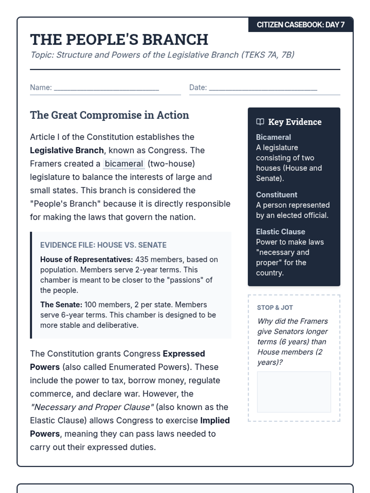 Day 7 Reader and Worksheet focusing on the structure and powers of the Legislative Branch (TEKS 7A, 7B). Covers bicameralism and expressed vs. implied powers.