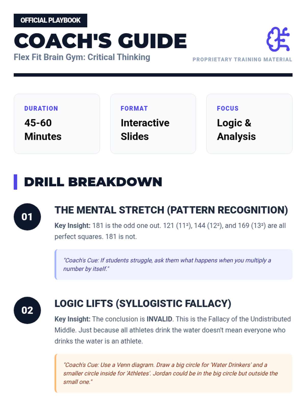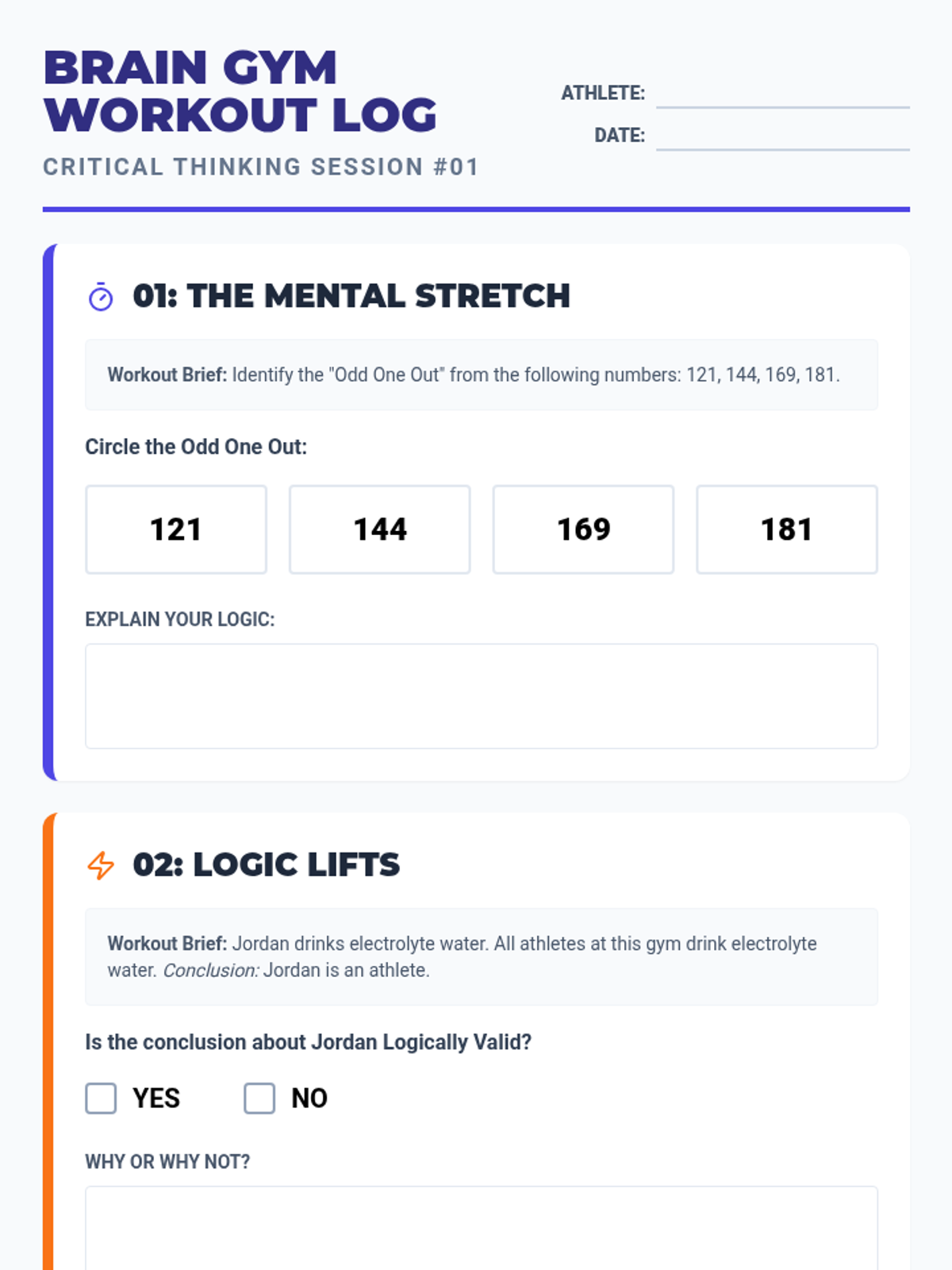 A high-energy, fitness-themed slide deck designed to lead students through various critical thinking exercises, from pattern recognition to bias detection and deep philosophical analysis. Revised for improved layout and uniform styling.