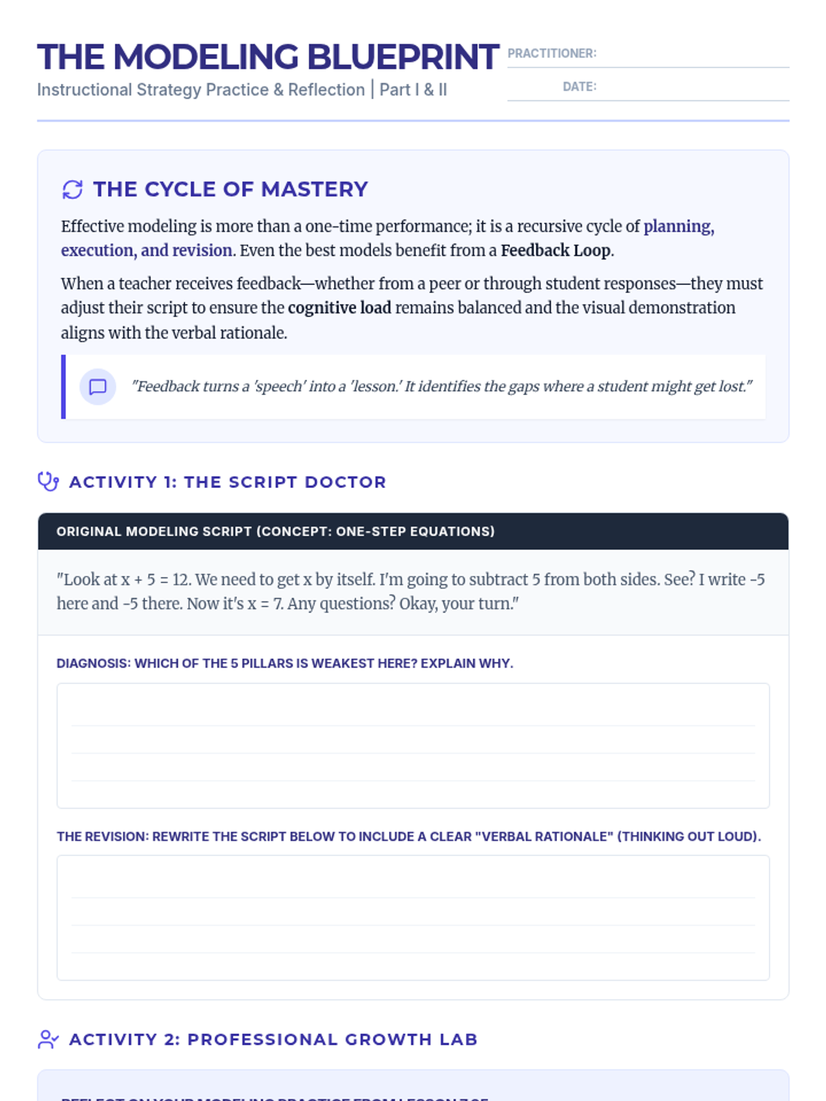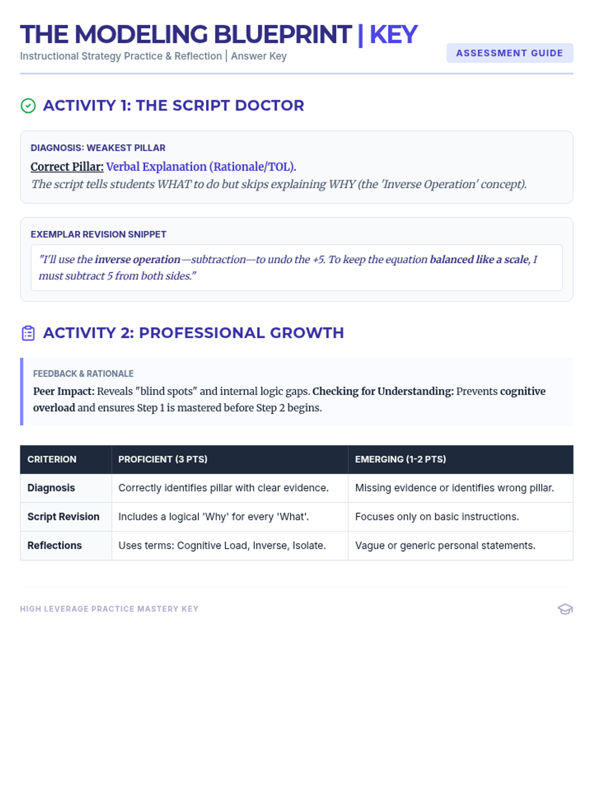 A detailed answer key and grading rubric for the Modeling Blueprint worksheet. Includes exemplar "Thinking Out Loud" scripts, diagnosis of common modeling errors, and criteria for assessing student reflections on the feedback loop.