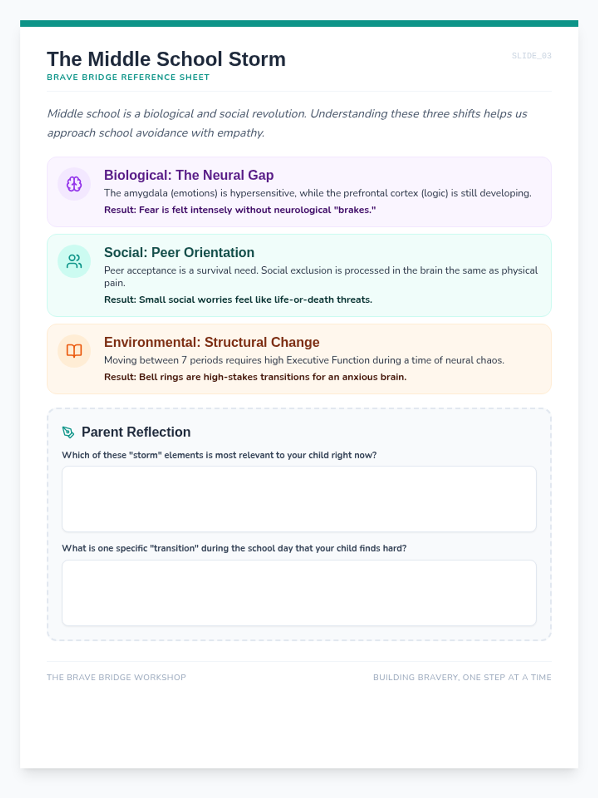 A reference handout for parents and caregivers explaining the biological, social, and academic factors that contribute to school avoidance in middle school.