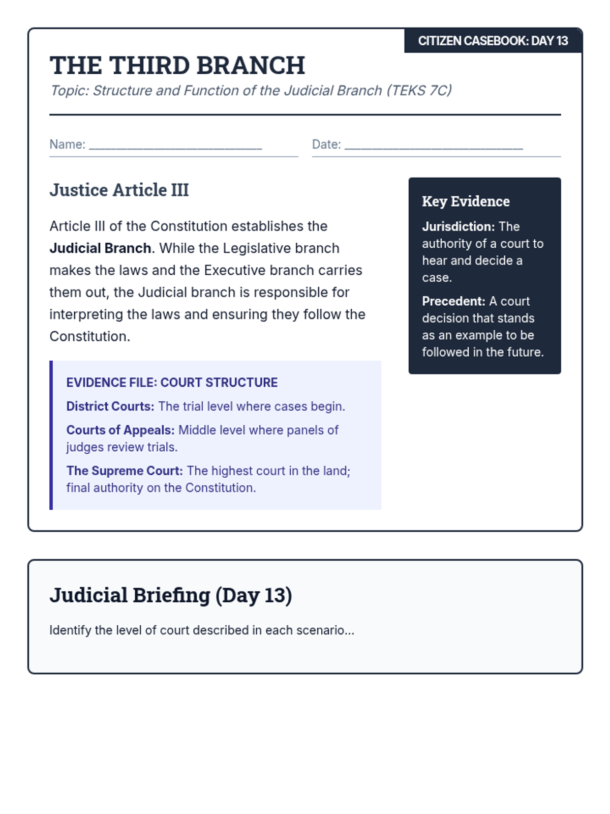 Day 13 Reader and Worksheet (formerly Day 7). Updated for the 25-day schedule. Covers the structure of the Judicial Branch.