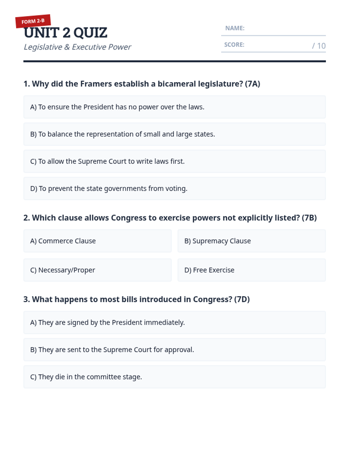 A 10-question multiple-choice quiz for Unit 2 (The Power Centers). Tests knowledge of legislative structure, lawmaking, presidential roles, and the bureaucracy.