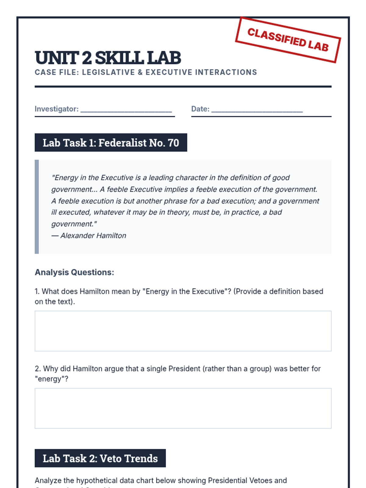 Day 11 Skill Lab for Unit 2. Features primary source analysis of Federalist No. 70, data trend analysis of vetoes, and a complex legislative process scenario.