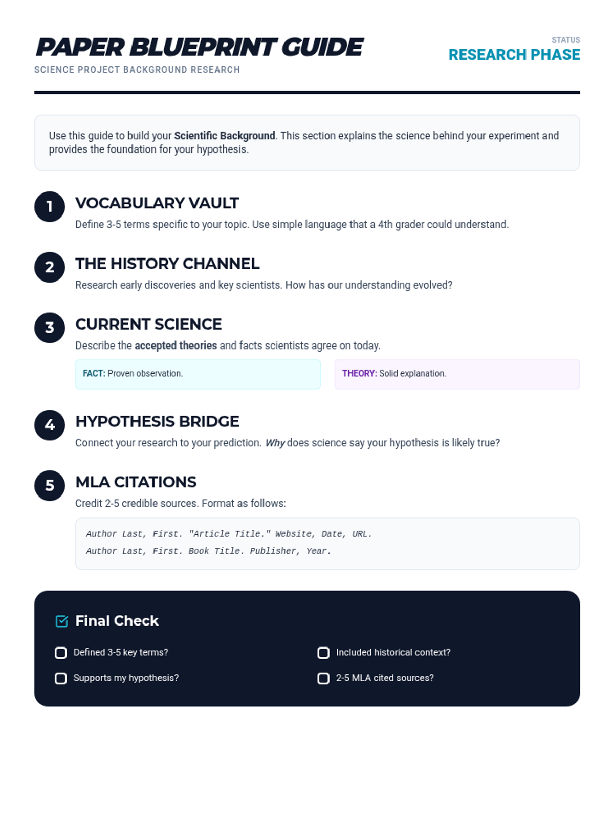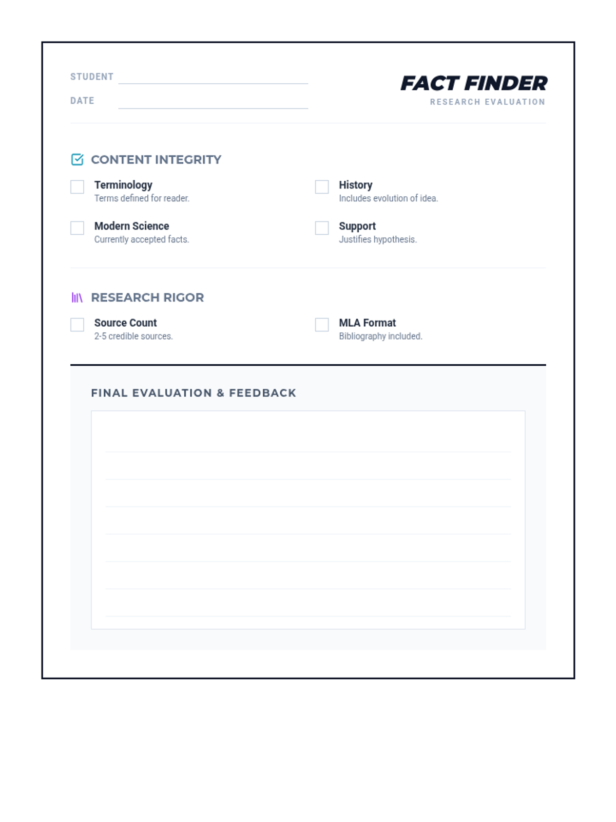 A checklist for both teachers and students to ensure all project requirements—terminology, history, modern science, and MLA citations—are met.
