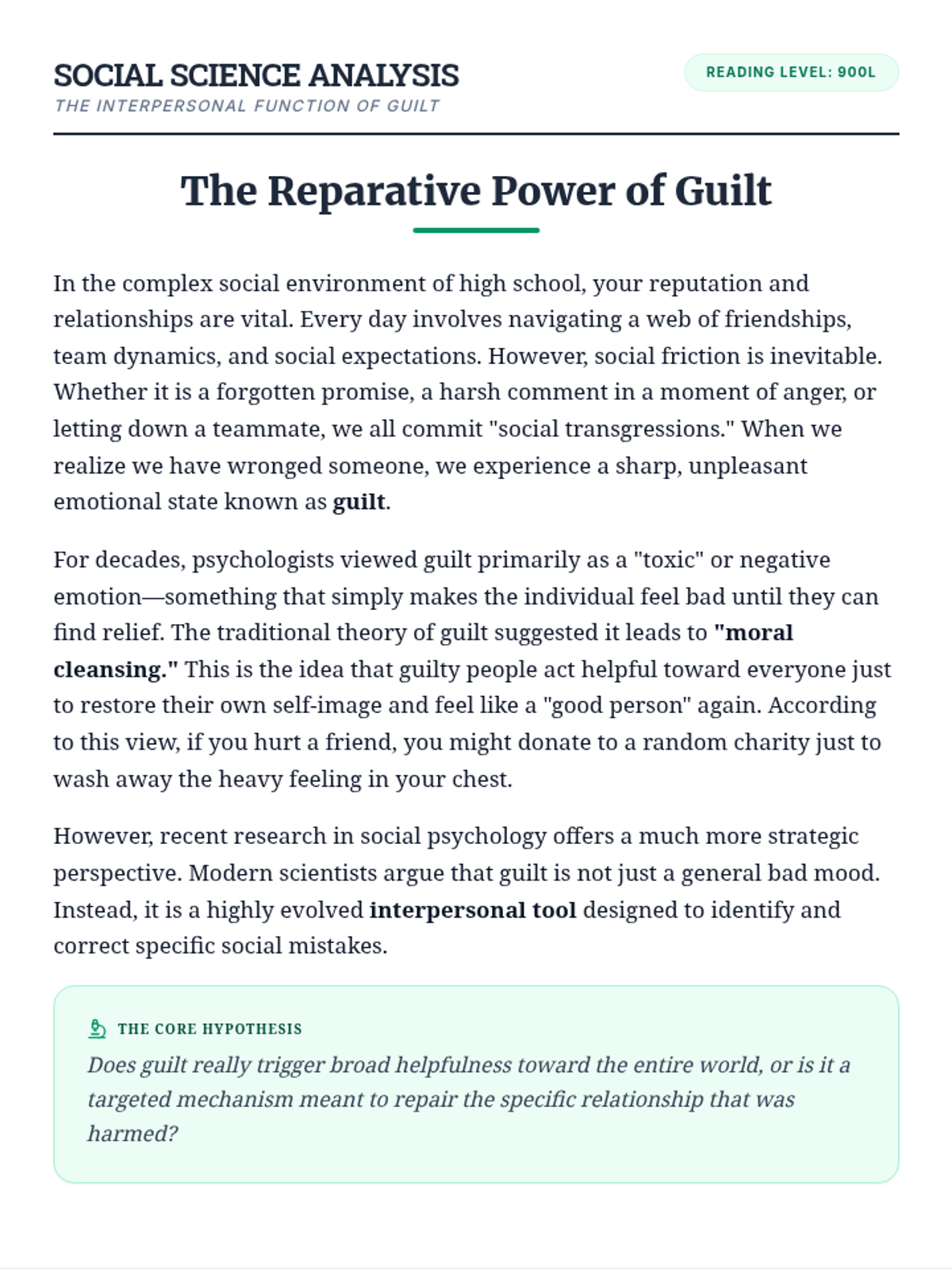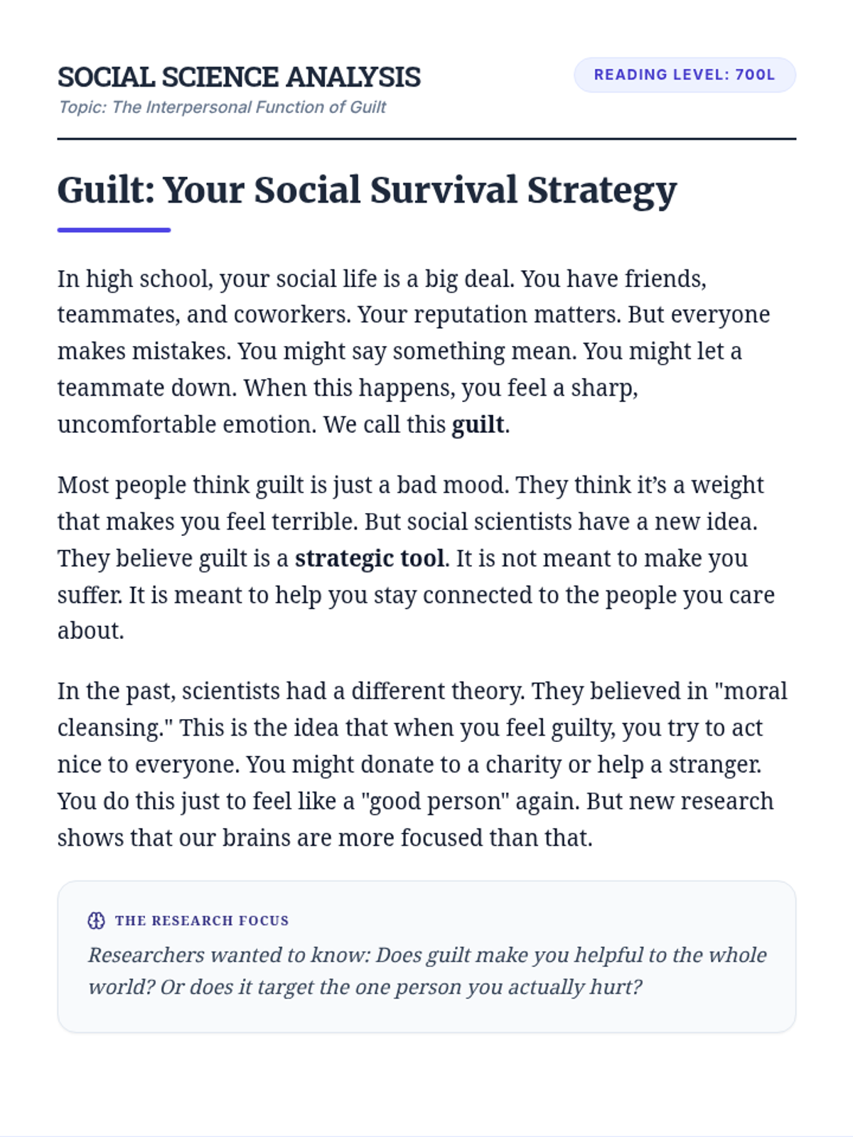 A 4-page student-facing article leveled to 700L for sustained silent reading. It simplifies complex social psychology research into a mature, high-school-appropriate narrative about the interpersonal functions of guilt, followed by a comprehension assessment.
