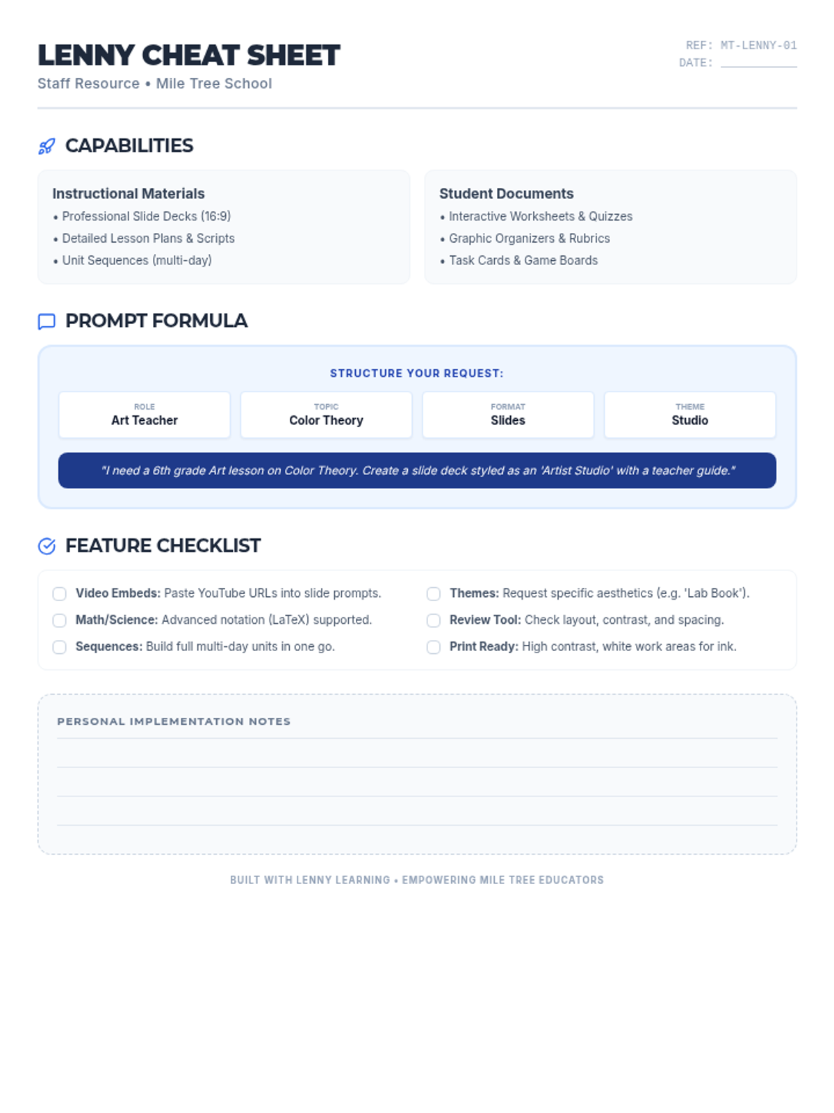 A concise, print-ready reference guide for Mile Tree School staff, summarizing Lenny Learning's core capabilities, prompting strategies, and key features.