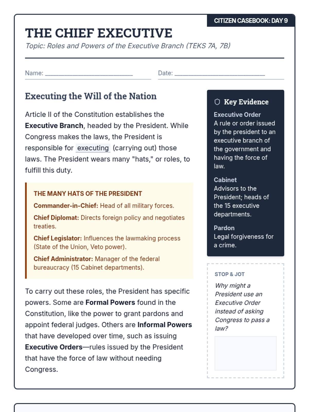 Day 9 Reader and Worksheet focusing on the roles and powers of the President (TEKS 7A, 7B). Includes a role-matching activity and critical thinking about executive power growth.