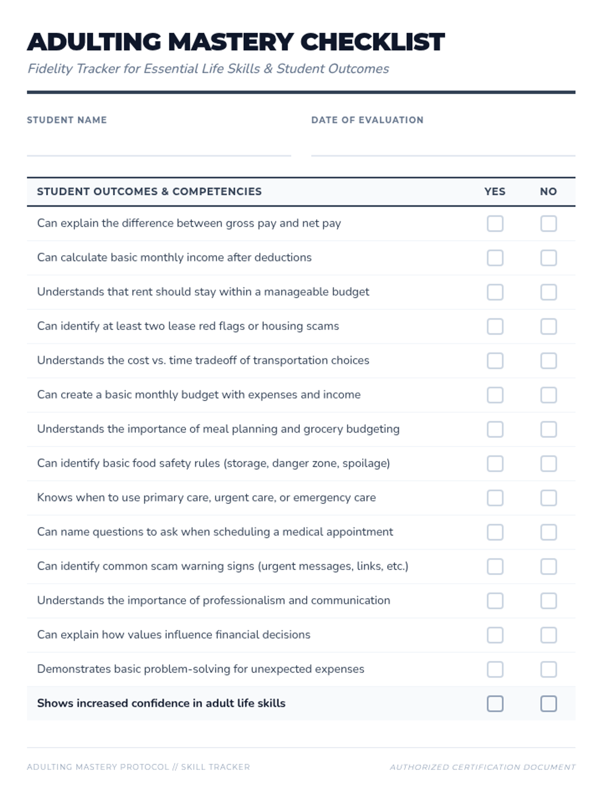 A professional single-page fidelity checklist for teachers to track student mastery of 15 key adulting and life skills. Tightened layout to ensure single-page fit.