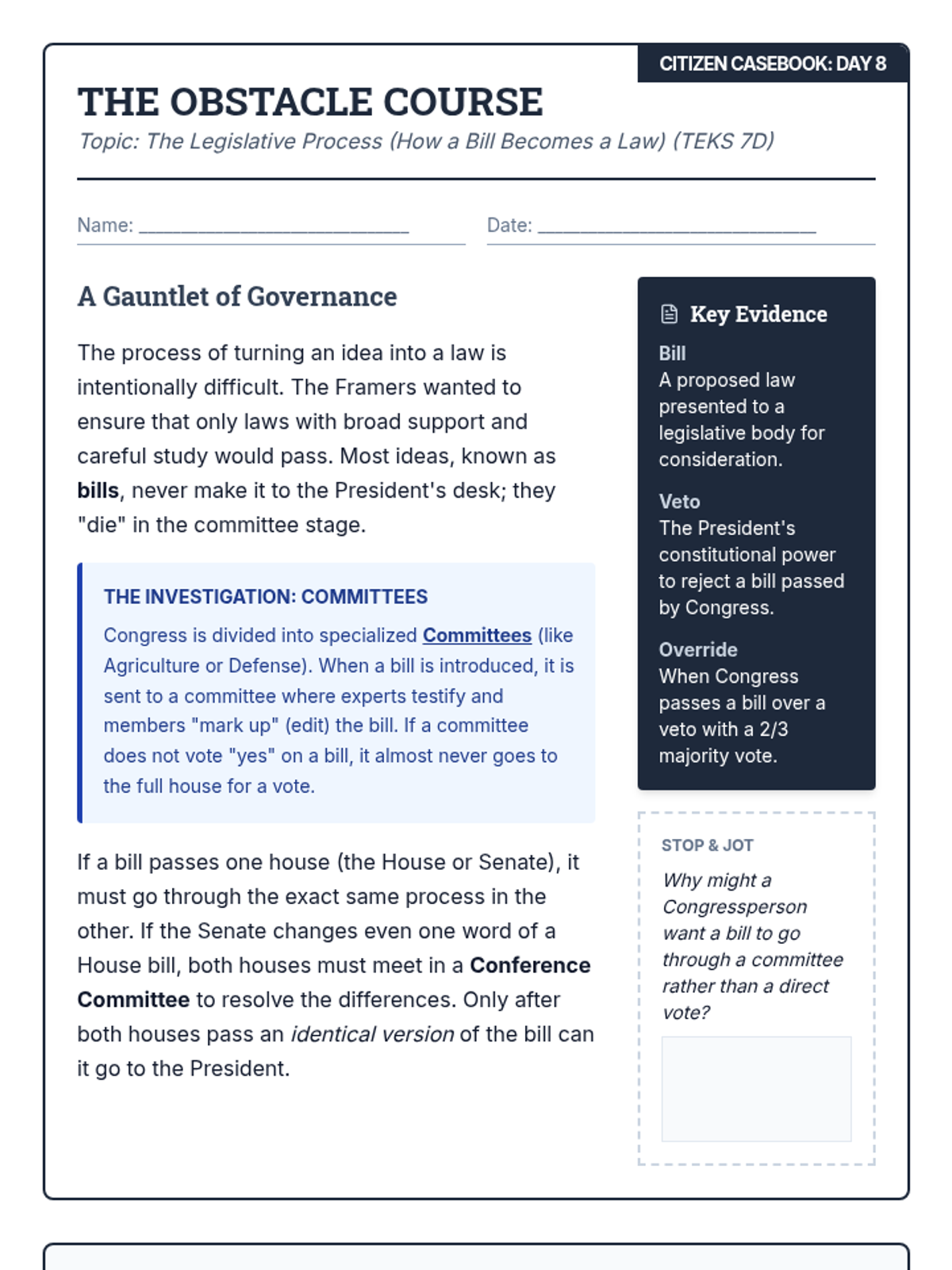 Day 8 Reader and Worksheet focusing on the legislative process (TEKS 7D). Features a sequencing activity and cause-and-effect skill practice regarding how a bill becomes a law.