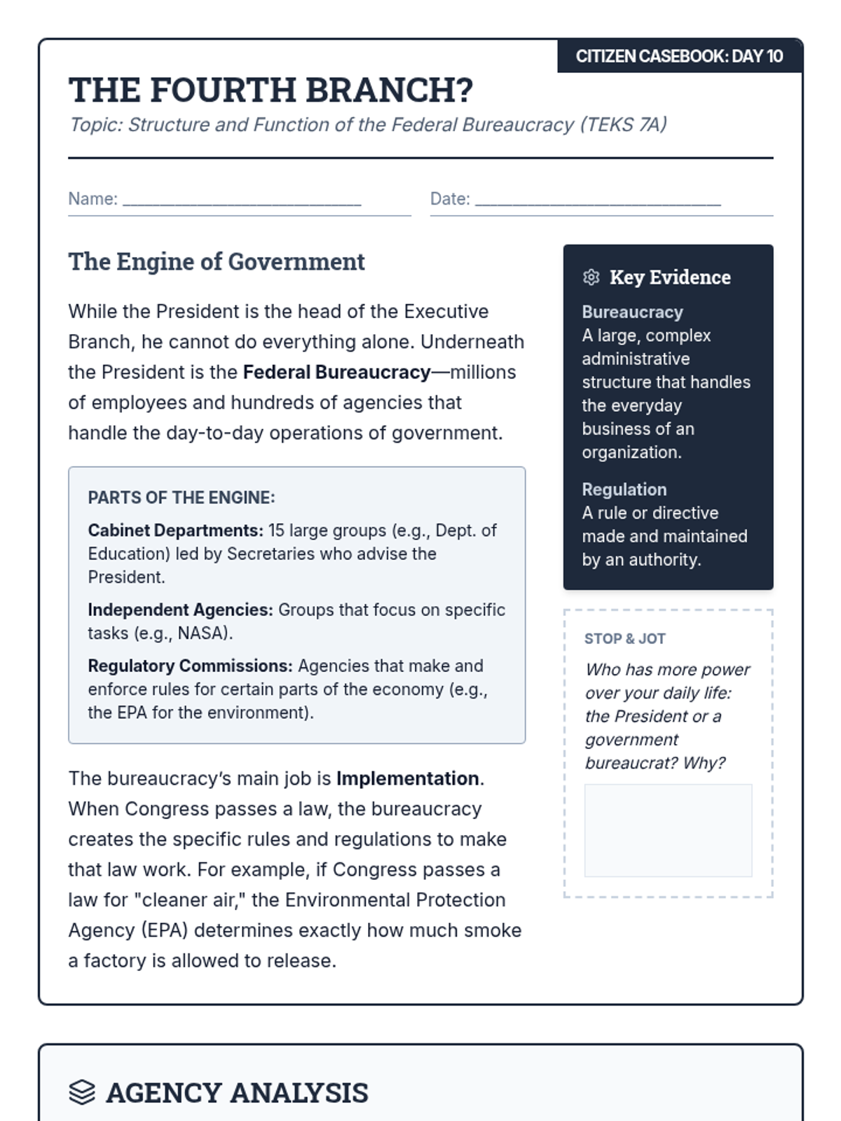 Day 10 Reader and Worksheet focusing on the federal bureaucracy (TEKS 7A). Covers cabinet departments, independent agencies, and the concept of regulatory implementation.