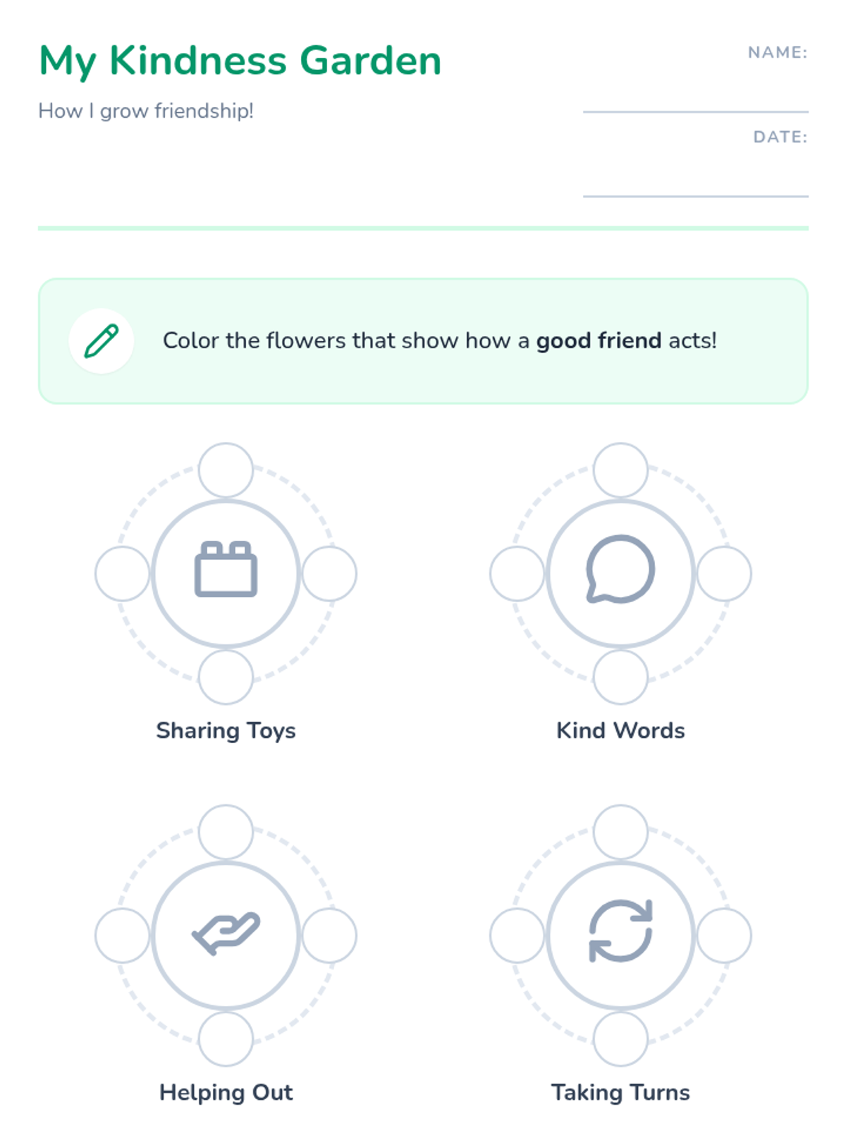 A colorful slide deck for PreK students to learn the basics of friendship, including sharing, kind words, and helping others.