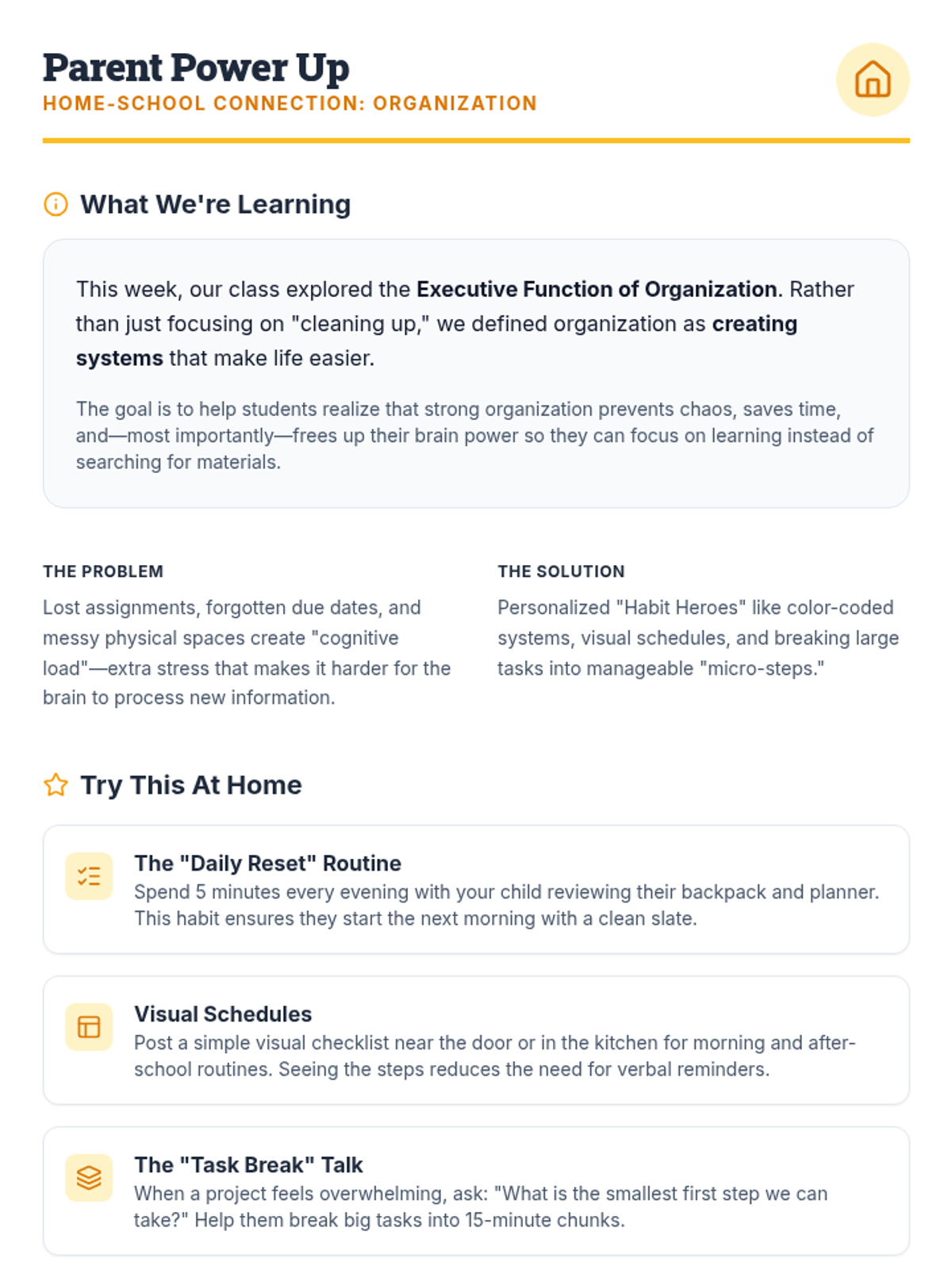 A one-page resource for parents explaining the organization lesson's purpose, offering home transfer strategies, and providing curated video resources.