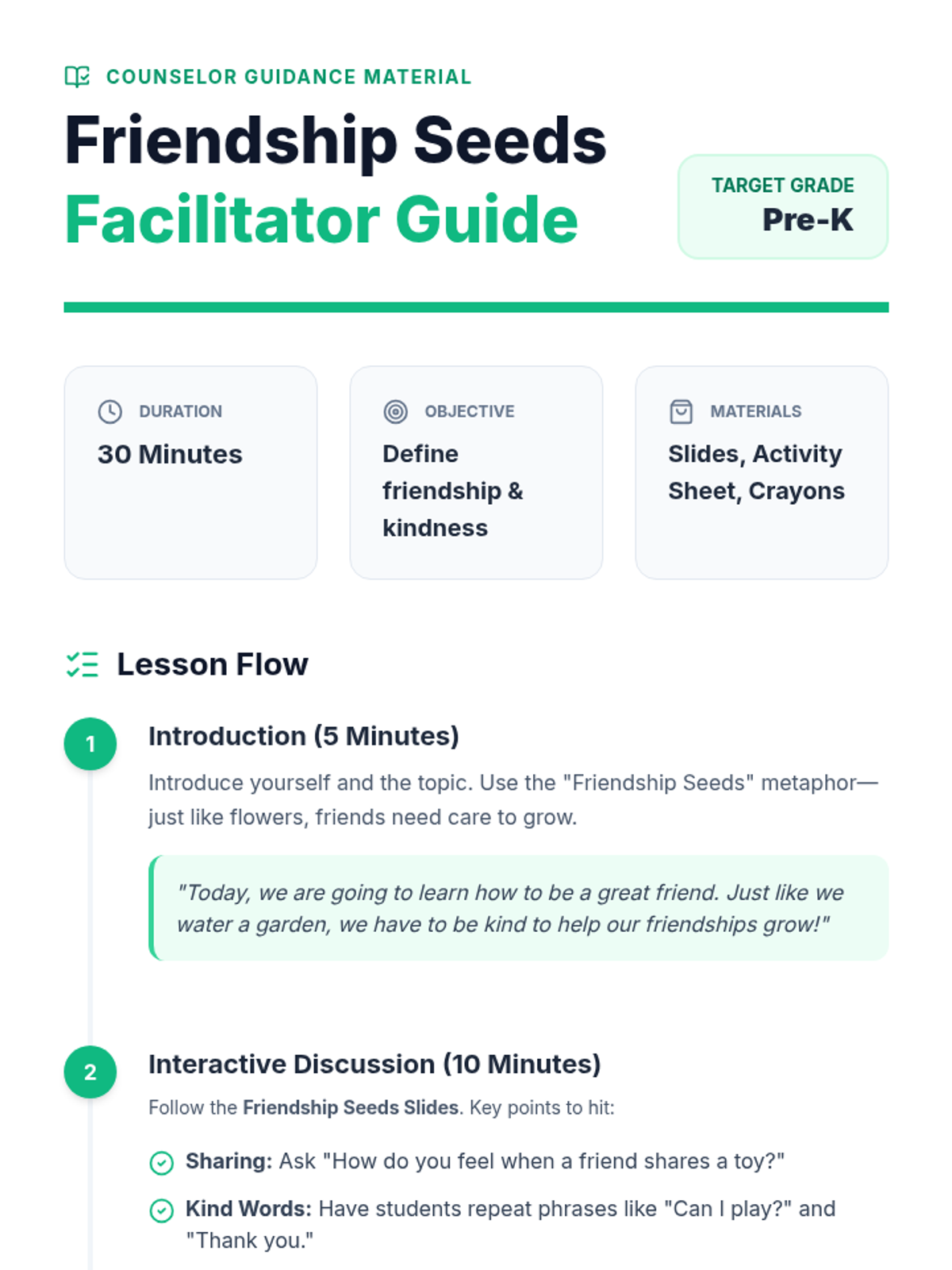 A comprehensive teacher guide for facilitating a 30-minute PreK lesson on friendship, including a timed lesson flow and instructional scripts.