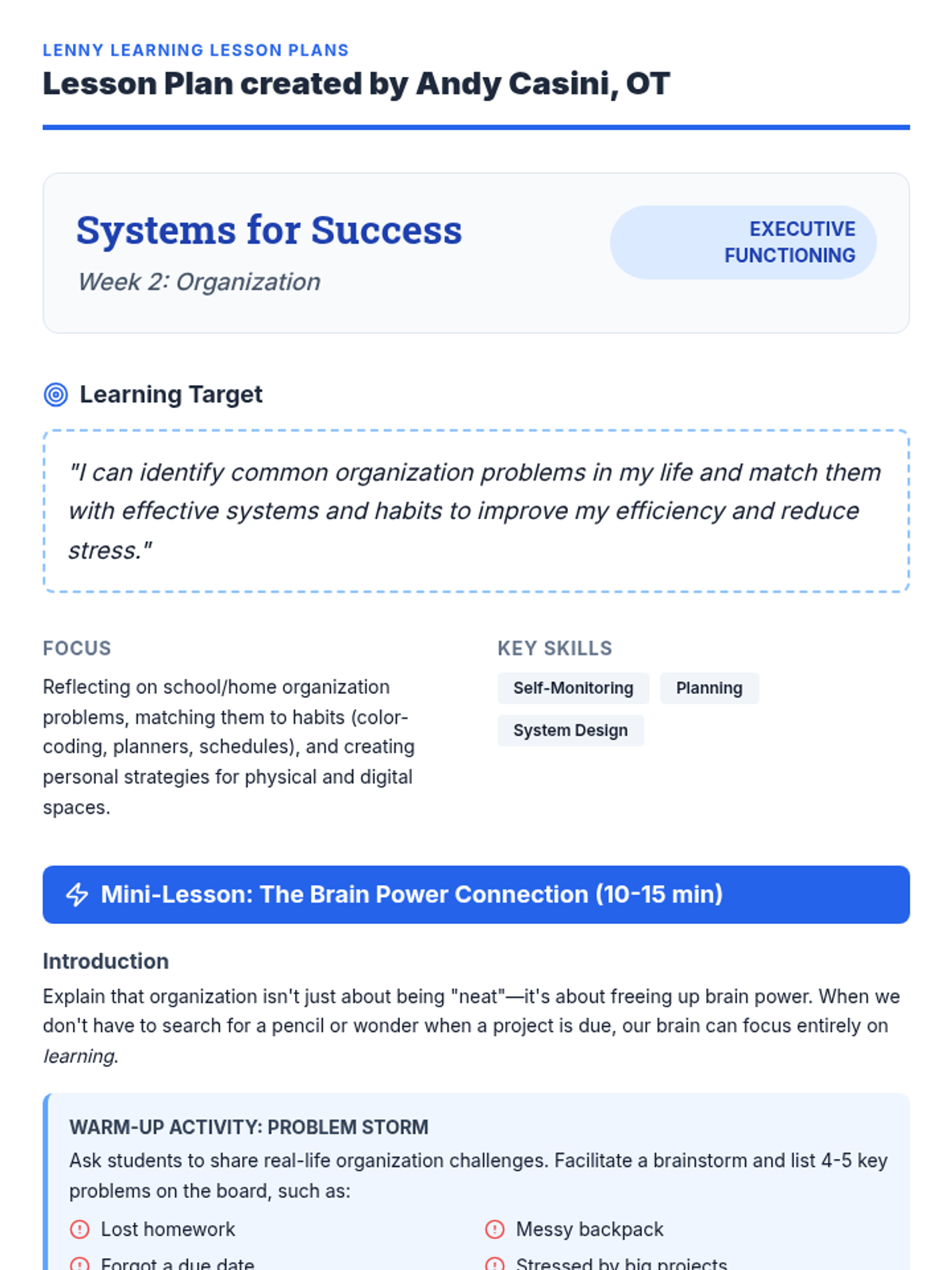 A professional lesson plan for teachers, detailing mini-lessons, group tasks, and independent work for teaching organizational skills, including classroom transfer strategies.