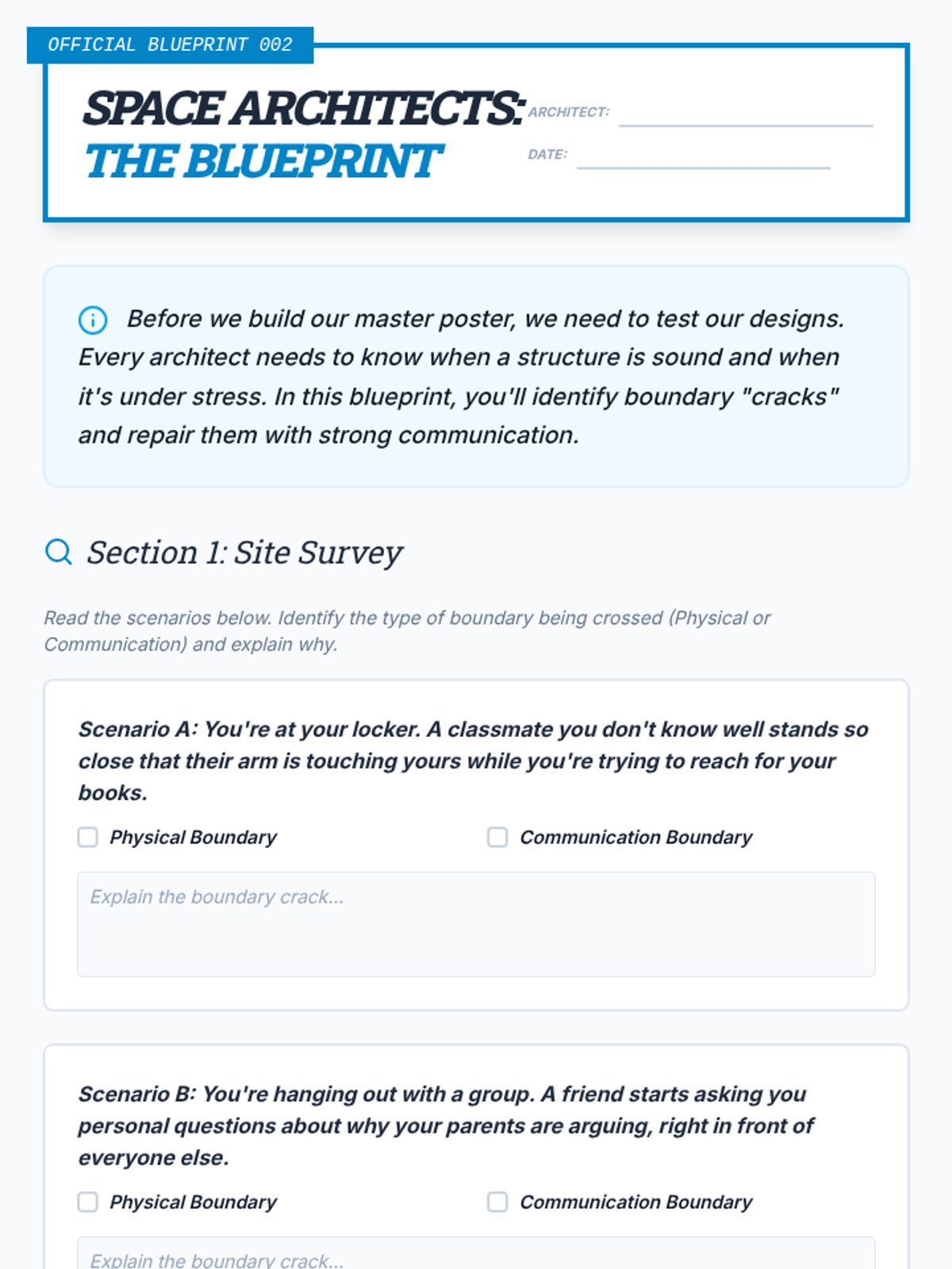 Student worksheet for Lesson 4 providing comic strip scenarios where students fill in speech and thought bubbles for stick figures.