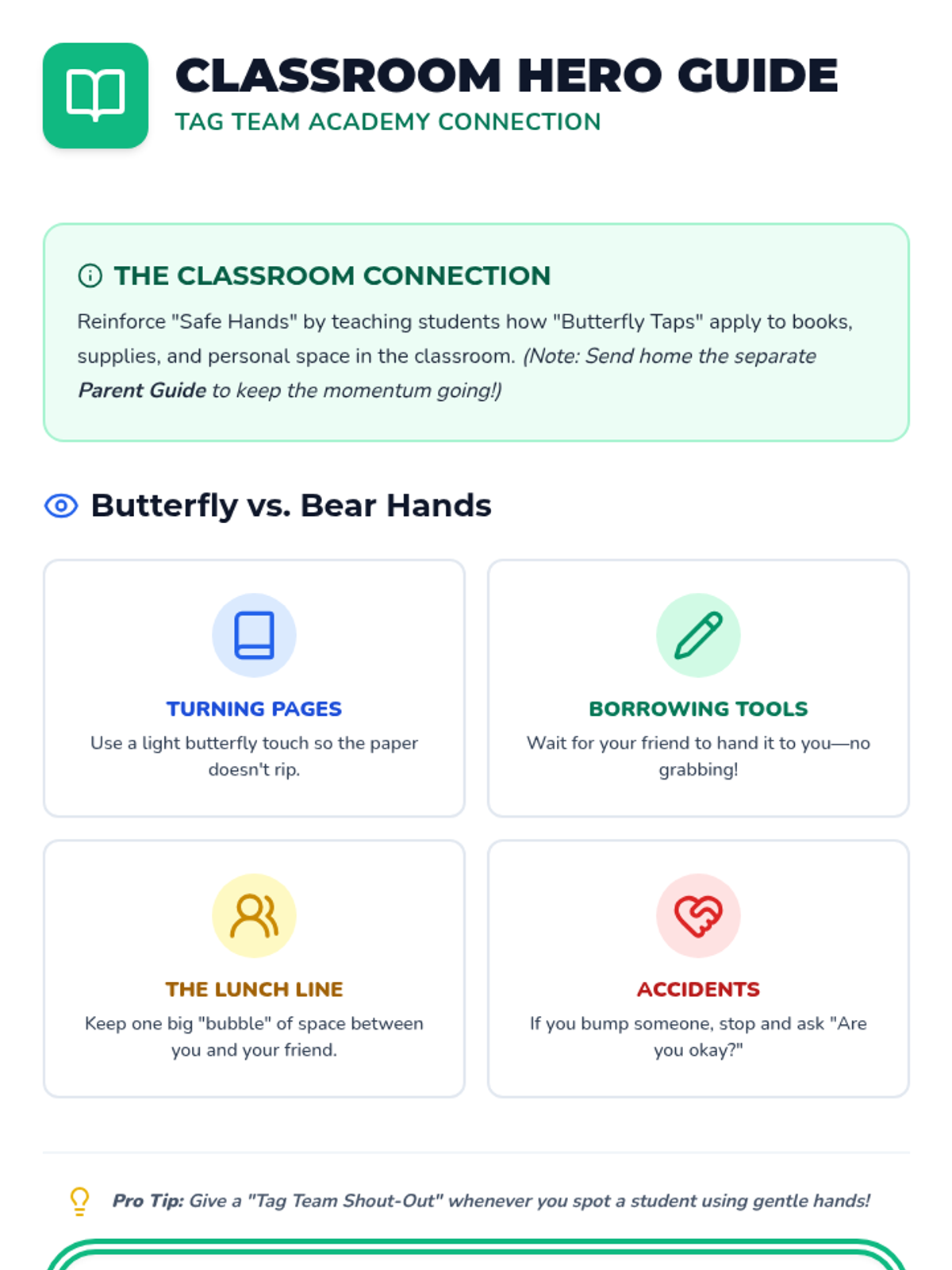 A teacher-facing resource to bridge the PE lesson into the classroom. It includes discussion scenarios for 'Butterfly vs. Bear' hands, tips for classroom reinforcement, and a 'Safe Hands Pledge' certificate for the class to sign and display.