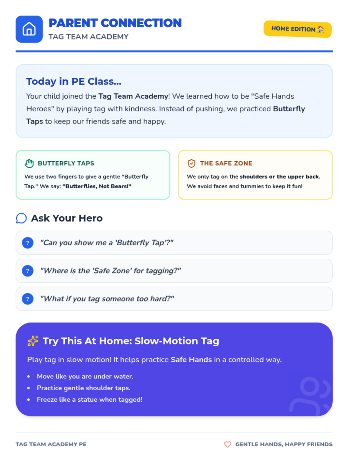 A parent-facing guide to reinforce the 'Safe Hands' lesson at home. It explains the core concepts of Butterfly Taps and Safe Zones, provides conversation starters, and suggests a slow-motion tag activity for families.