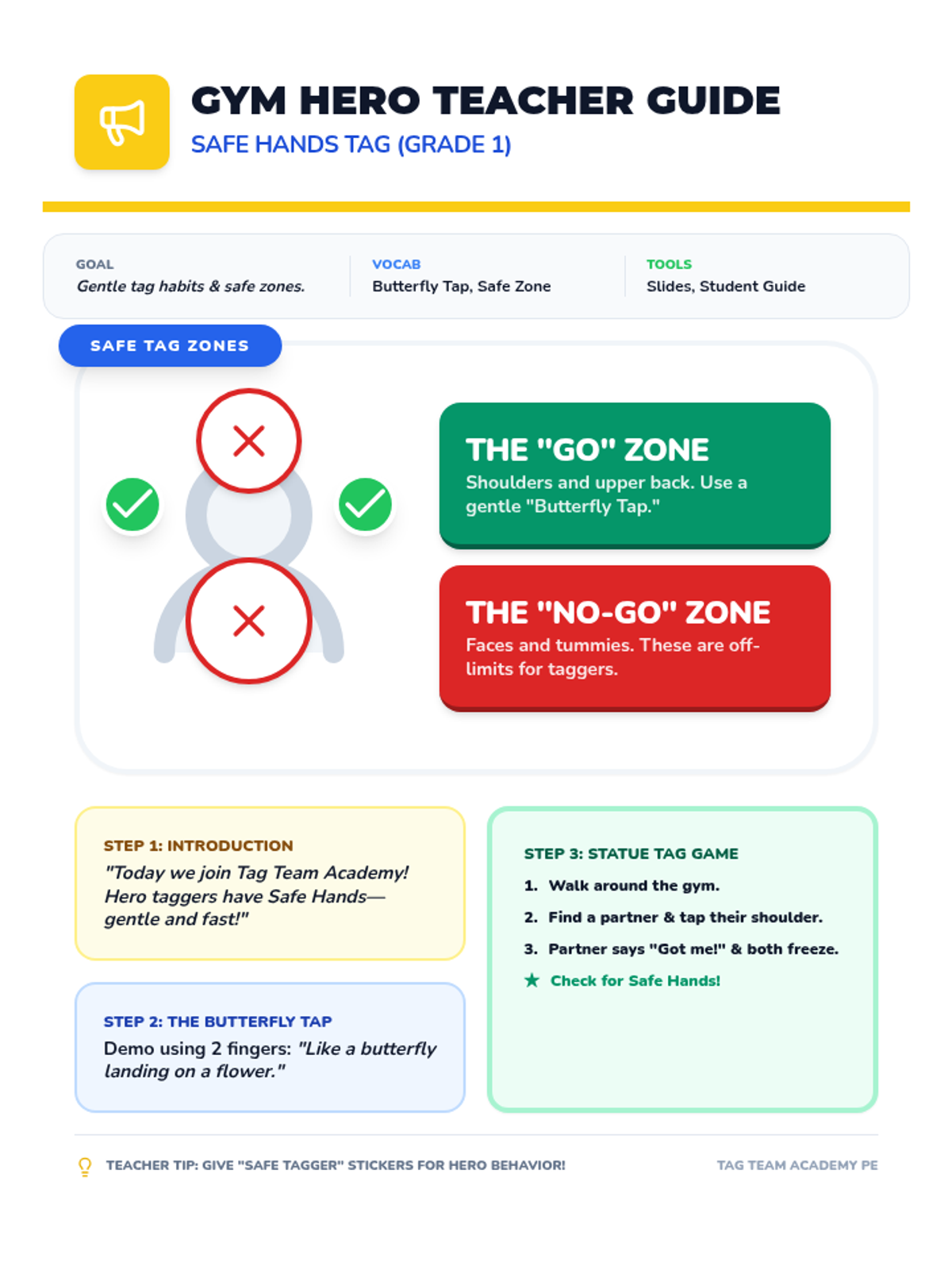 A detailed teacher guide for delivering the 'Safe Hands' tag lesson. Includes an anatomical 'Tag Zones' silhouette for instructional support, step-by-step teaching sequence, and a practice game called 'Statue Tag'.