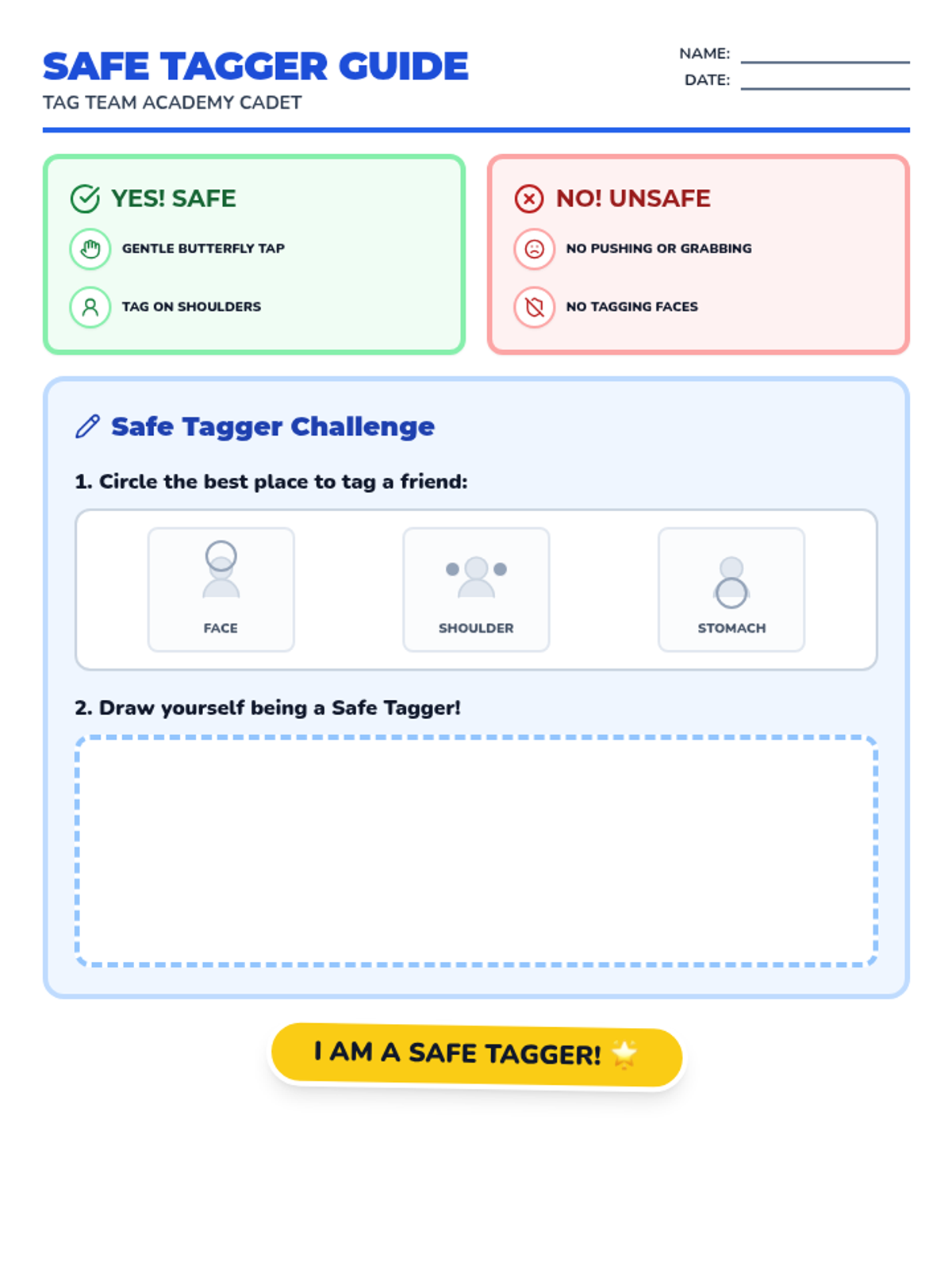A student-facing worksheet and visual aid for 1st graders to reinforce safe tagging habits. It includes clear 'Yes/No' visual guides and a drawing challenge for students to visualize themselves as safe players.