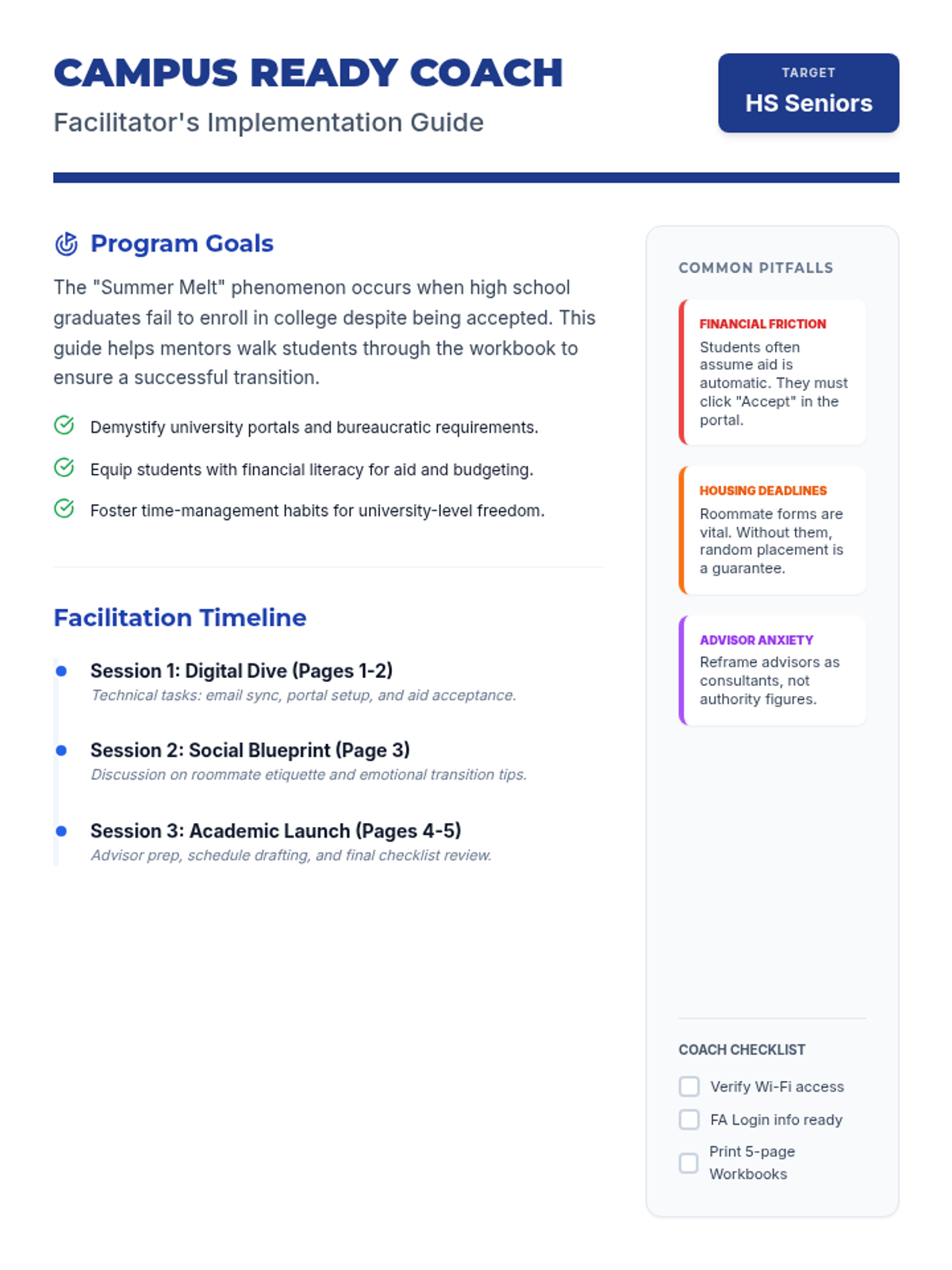 A facilitator guide for teachers or mentors implementing the Campus Ready program. It includes program goals, a facilitation timeline, and strategies for overcoming common student pitfalls during the college transition.
