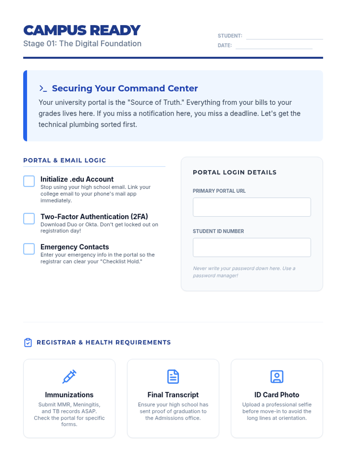 A 5-page interactive workbook for graduating seniors preparing for college. Includes sections on portal setup, financial aid navigation, roommate questionnaires, academic registration, and a comprehensive master checklist.