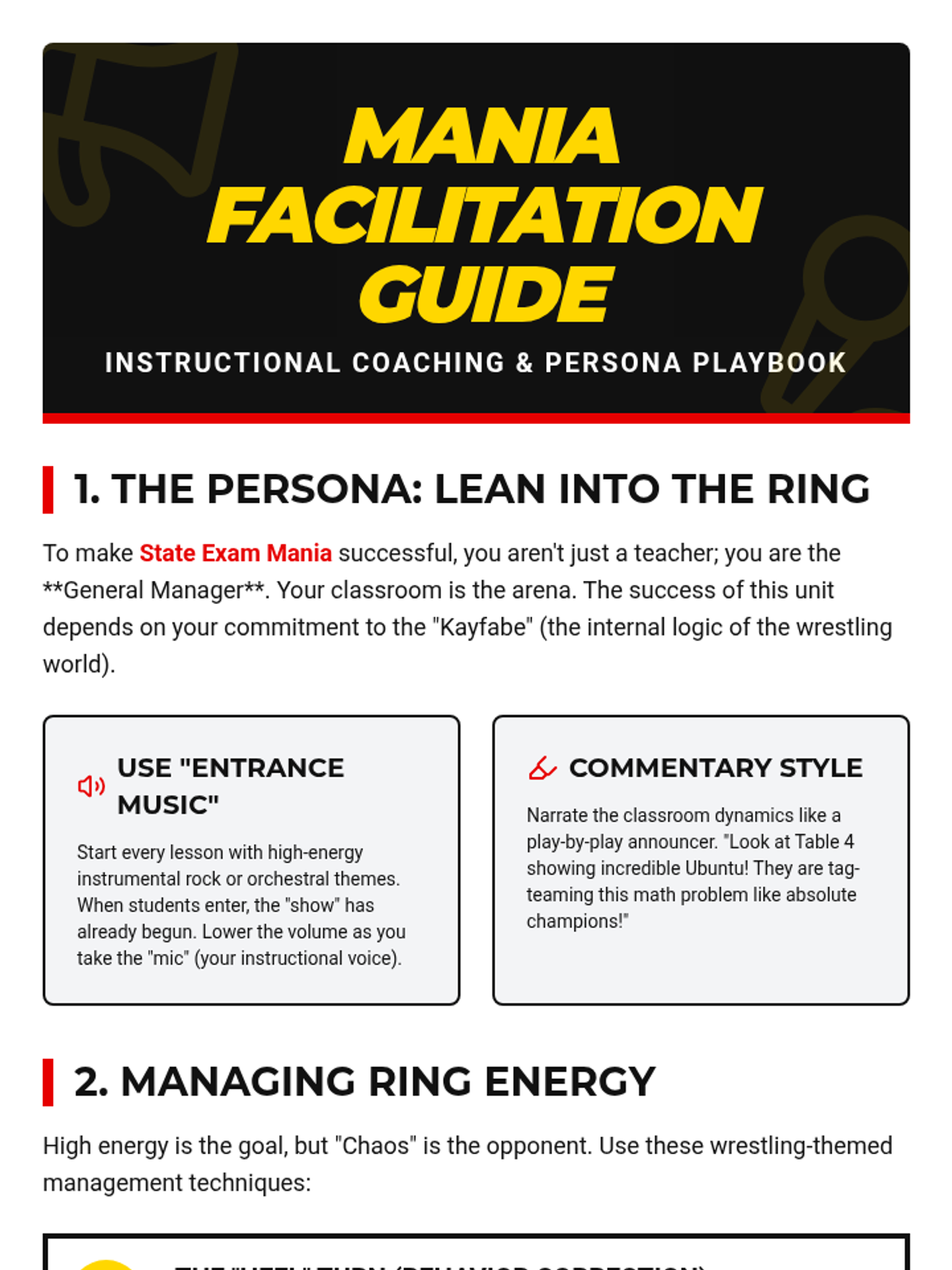 A comprehensive teacher facilitation guide for the 'Road to State Exam Mania' sequence, featuring persona coaching, behavior management strategies (using wrestling metaphors), lesson-specific tips, and a bank of discussion questions.