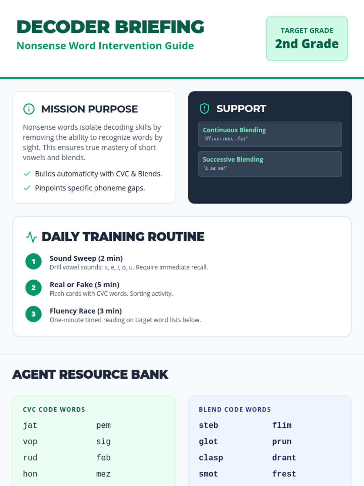 A teacher's instructional guide providing strategies for teaching nonsense word decoding, including blending routines, scaffolding tips, and target word lists.