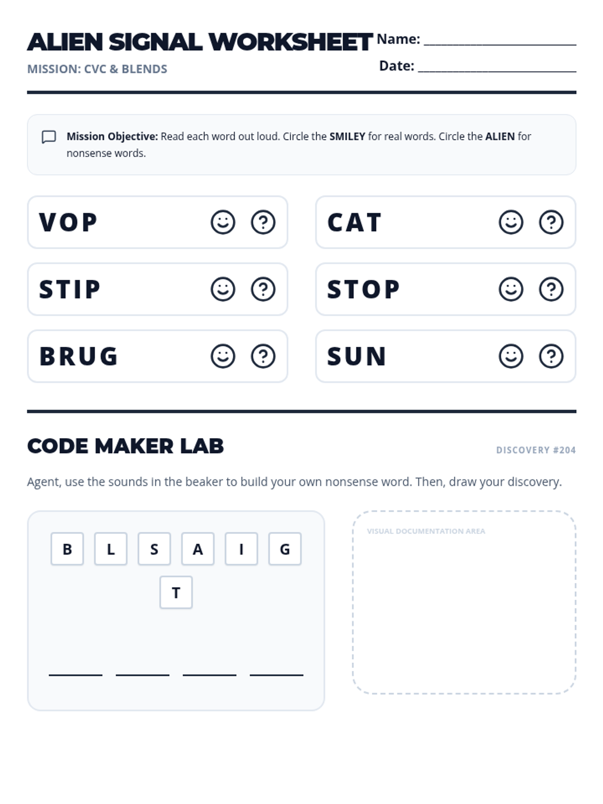 A student worksheet for identifying and decoding CVC and blend nonsense words versus real words, featuring a sorting activity and a creative 'Code Maker' lab section.