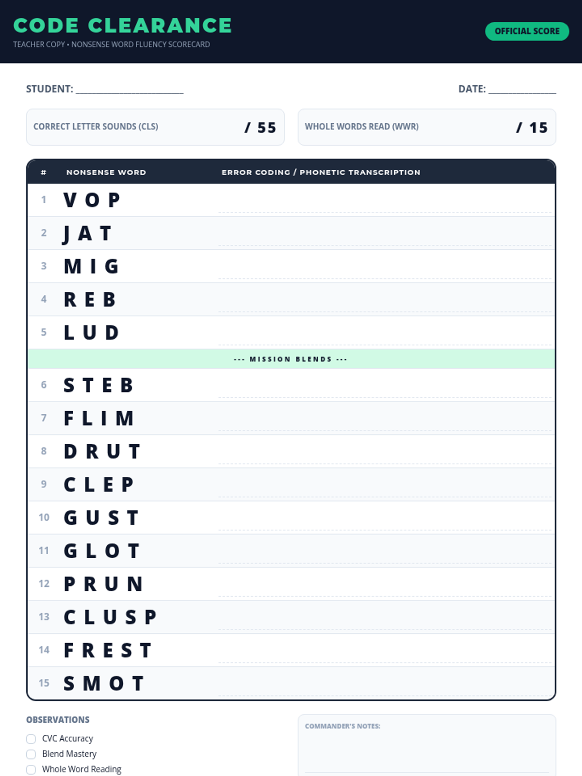A teacher-led assessment tool for measuring nonsense word fluency with an expanded 15-word list covering CVC and blend patterns. Fits entirely on a single page for teacher convenience.